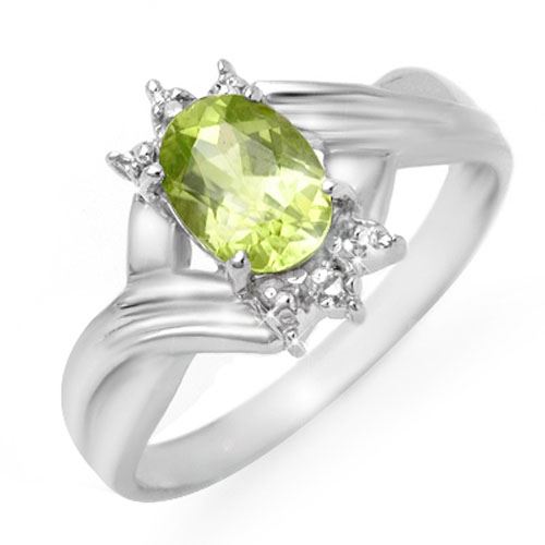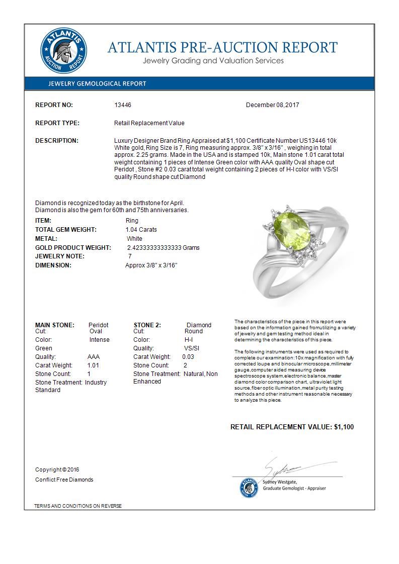 REF-15K5W -13446 ---- 1.04 CTW Peridot & Diamond Ring 10K White Gold ---- Luxury Designer Brand Ring Appraised at $1,100 Certificate Number US13446 10k White gold, Ring Size is 7, Ring measuring approx. 3/8" x 3/16" , weighing in total approx. 2.25 grams. Made in the USA and is stamped 10k, Main stone 1.01 carat total weight containing 1 pieces of Intense Green color with AAA quality Oval shape cut Peridot , Stone #2 0.03 carat total weight containing 2 pieces of H-I color with VS/SI quality Round shape cut Diamond