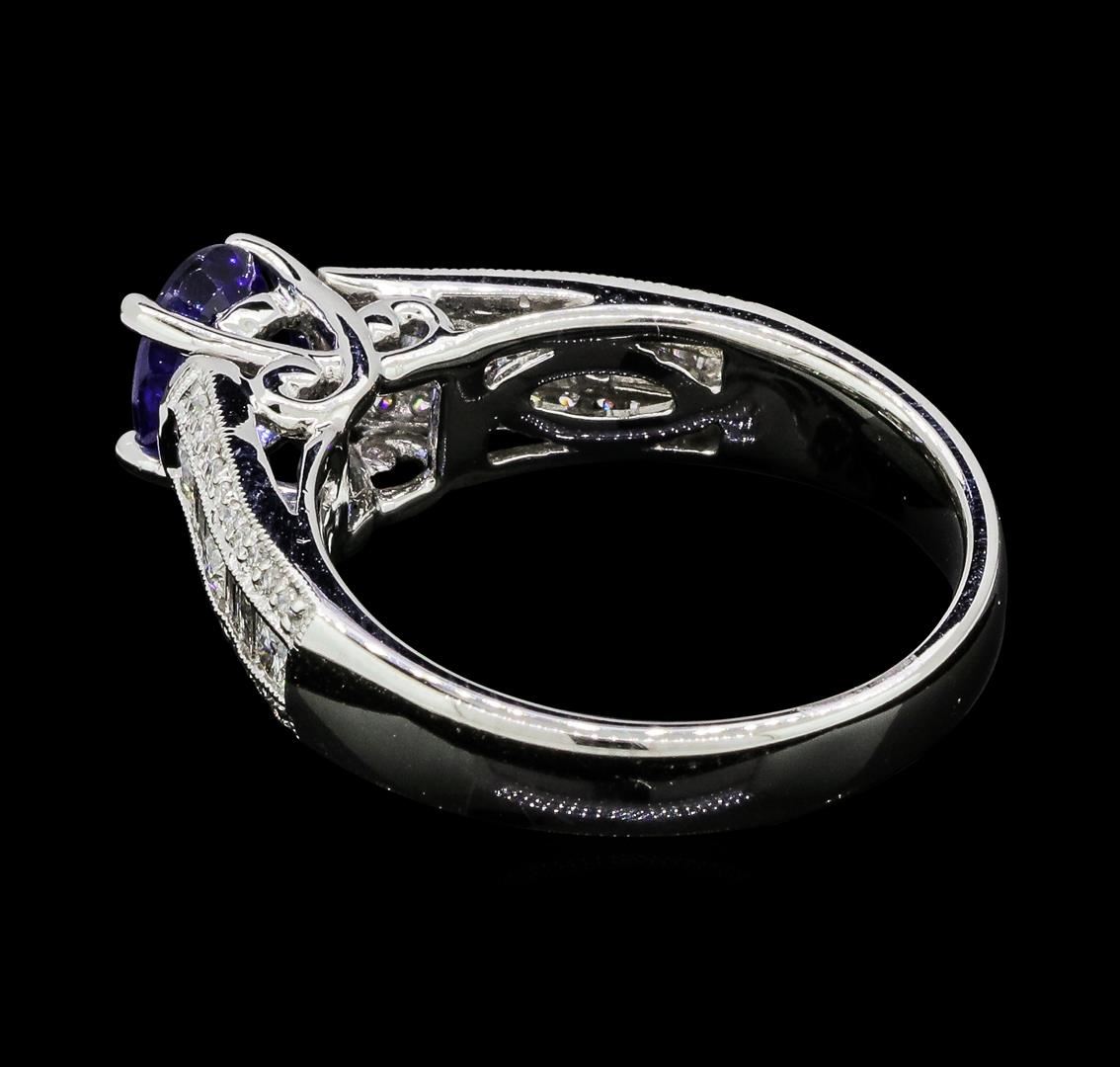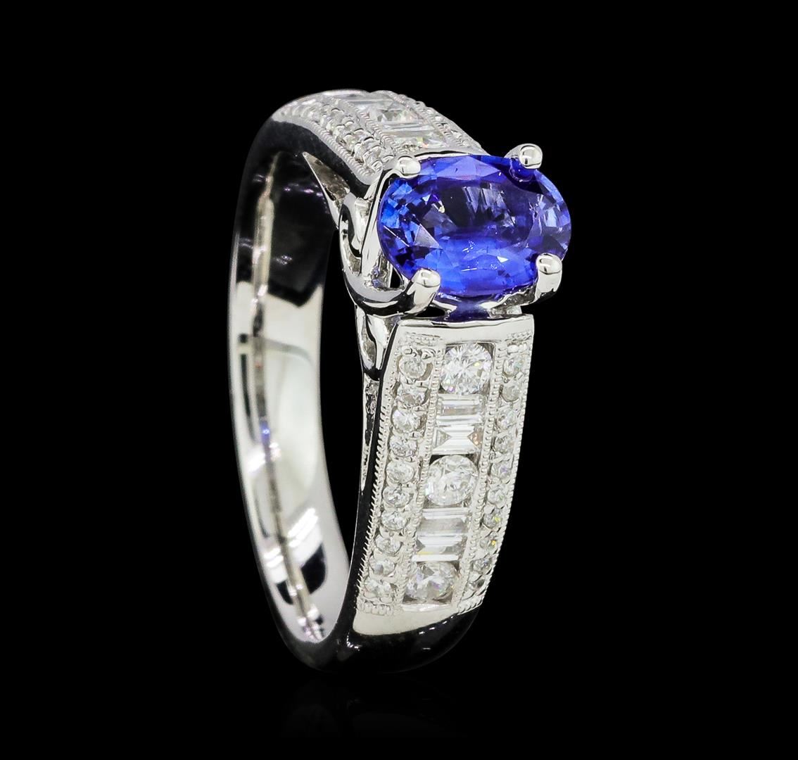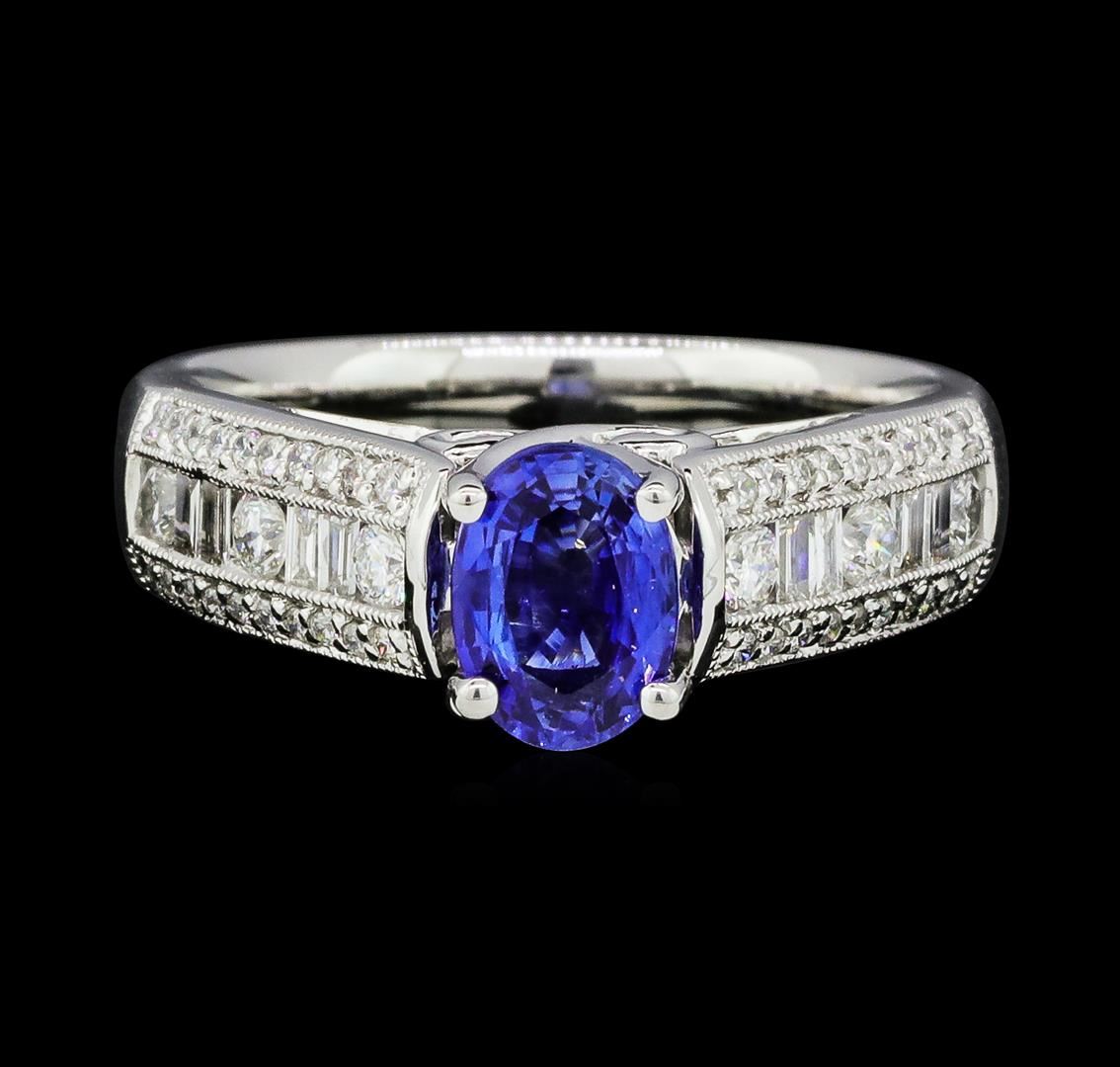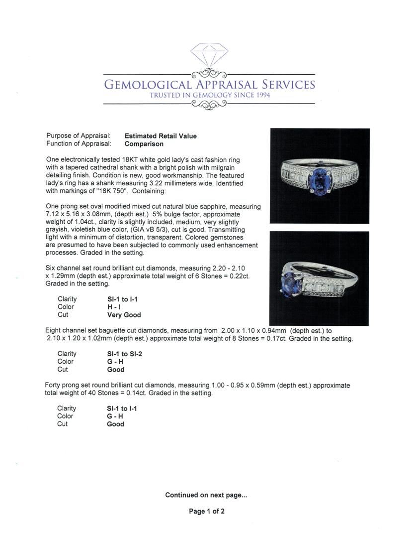 One electronically tested 18KT white gold lady's cast fashion ring with a tapered cathedral shank with a bright polish with milgrain detailing finish. The featured lady's ring has a shank measuring 3.22 millimeters wide. Identified with markings of '18K 750'. Condition is new, good workmanship. Containing: One prong set oval modified mixed cut natural blue sapphire, measuring 7.12 x 5.16 x 3.08mm, (depth est.) 5%. bulge factor, approximate weight of 1.04ct., clarity is slightly included, medium, very slightly grayish, violetish blue color, (GIA vB 5/3), cut is good. Transmitting light with a minimum of distortion, transparent. Colored gemstones are presumed to have been subjected to commonly used enhancement processes. Graded in the setting. Six channel set round brilliant cut diamonds, measuring 2.20 - 2.10 x 1.29mm (depth est.) approximate total weight of 6 Stones = 0.22ct. Graded in the setting. Color H - I Clarity SI-1 to I-1 Cut Very Good Eight channel set baguette cut diamonds, measuring from 2.00 x 1.10 x 0.94mm (depth est.) to 2.10 x 1.20 x 1.02mm (depth est.) approximate total weight of 8 Stones = 0.17ct. Graded in the setting. Color G - H Clarity SI-1 to SI-2 Cut Good Forty prong set round brilliant cut diamonds, measuring 1.00 - 0.95 x 0.59mm (depth est.) approximate total weight of 40 Stones = 0.14ct. Graded in the setting. Color G - H Clarity SI-1 to I-1 Cut Good. Total Weight of Colored Stones 1.04ct.. Total Weight of Diamonds 0.53ct.. Total Weight of Ring 5.90gm GAS Appraised at $3830.00. GAS Appraised at $3,830.00.