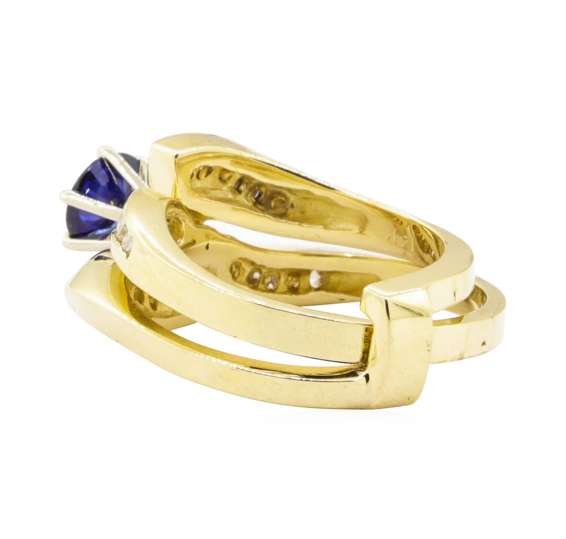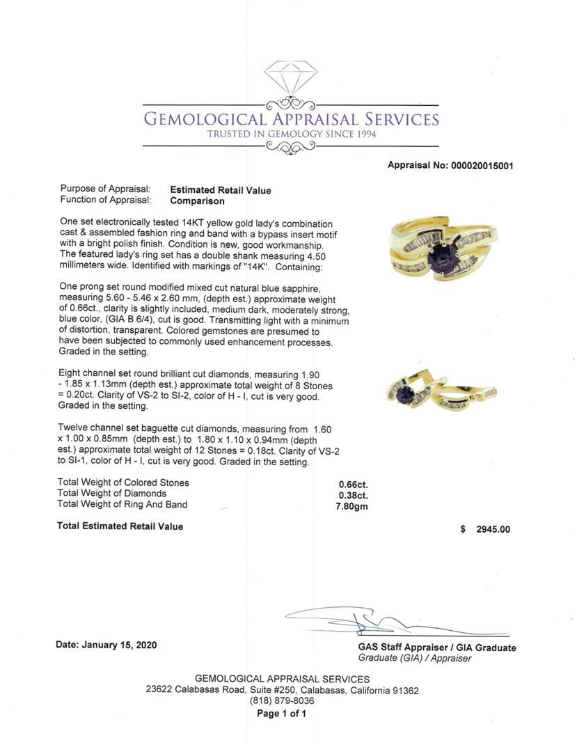One set electronically tested 14KT yellow gold lady's combination cast & assembled fashion ring and band with a bypass insert motif with a bright polish finish. The featured lady's ring set has a double shank measuring 4.50 millimeters wide. Identified with markings of '14K'. Condition is new, good workmanship. Containing: One prong set round modified mixed cut natural blue sapphire, measuring 5.60 - 5.46 x 2.60 mm, (depth est.) approximate weight of 0.66ct., clarity is slightly included, medium dark, moderately strong, blue color, (GIA B 6/4), cut is good. Transmitting light with a minimum of distortion, transparent. Colored gemstones are presumed to have been subjected to commonly used enhancement processes. Graded in the setting. Eight channel set round brilliant cut diamonds, measuring 1.90 - 1.85 x 1.13mm (depth est.) approximate total weight of 8 Stones = 0.20 ct. Graded in the setting. Color H - I Clarity VS-2 to SI-2 Cut Very Good Twelve channel set baguette cut diamonds, measuring from 1.60 x 1.00 x 0.85mm (depth est.) to 1.80 x 1.10 x 0.94mm (depth est.) approximate total weight of 12 Stones = 0.18ct. Graded in the setting. Color H - I Clarity VS-2 to SI-1 Cut Very Good. Total Weight of Colored Stones 0.66ct.. Total Weight of Diamonds 0.38ct.. Total Weight of Ring And Band 7.80gm GAS Appraised at $2945.00. GAS Appraised.