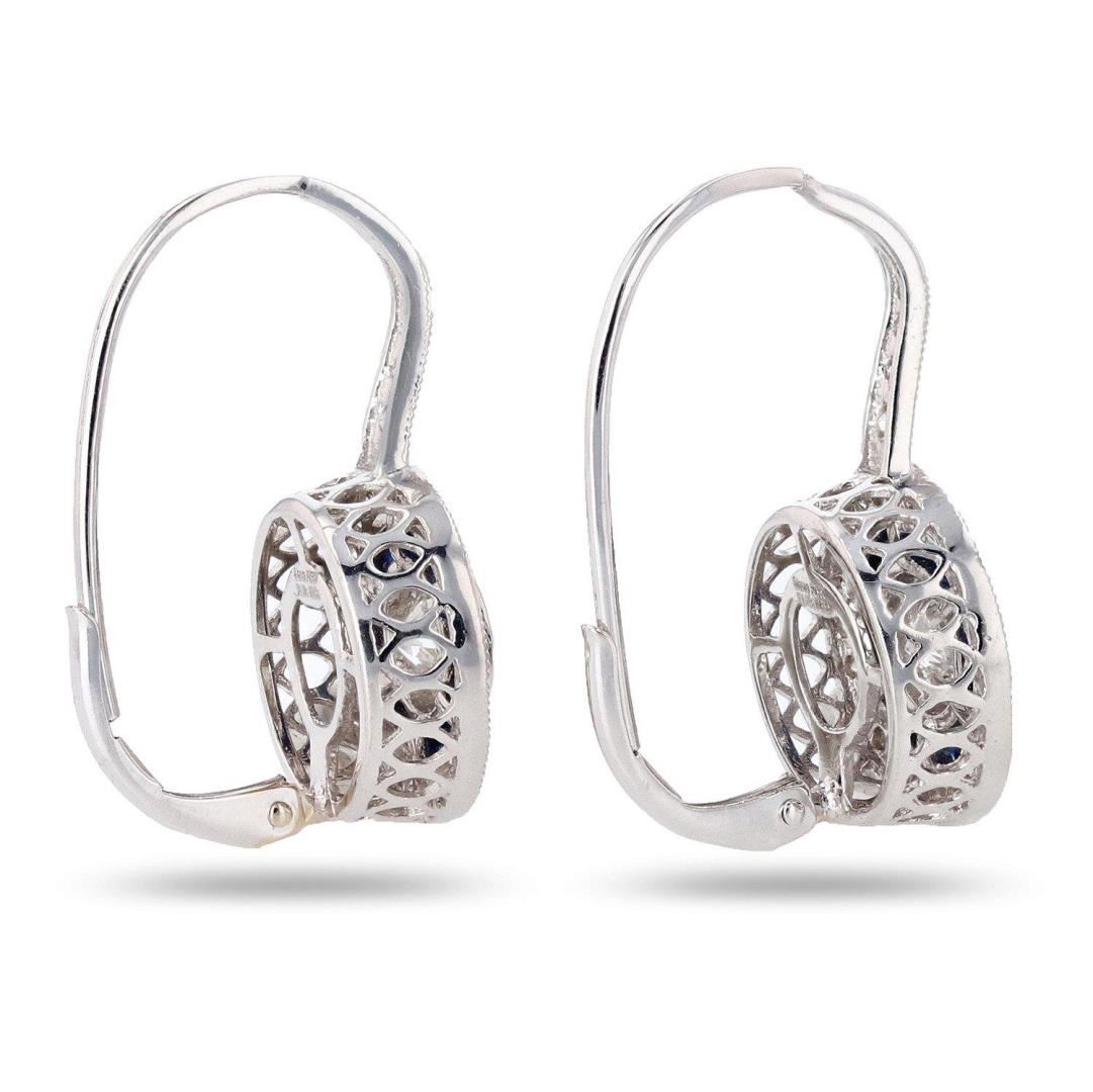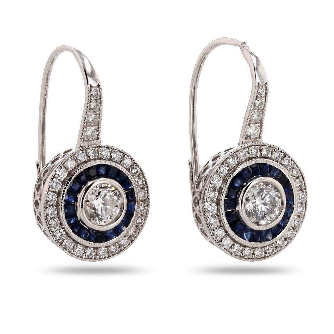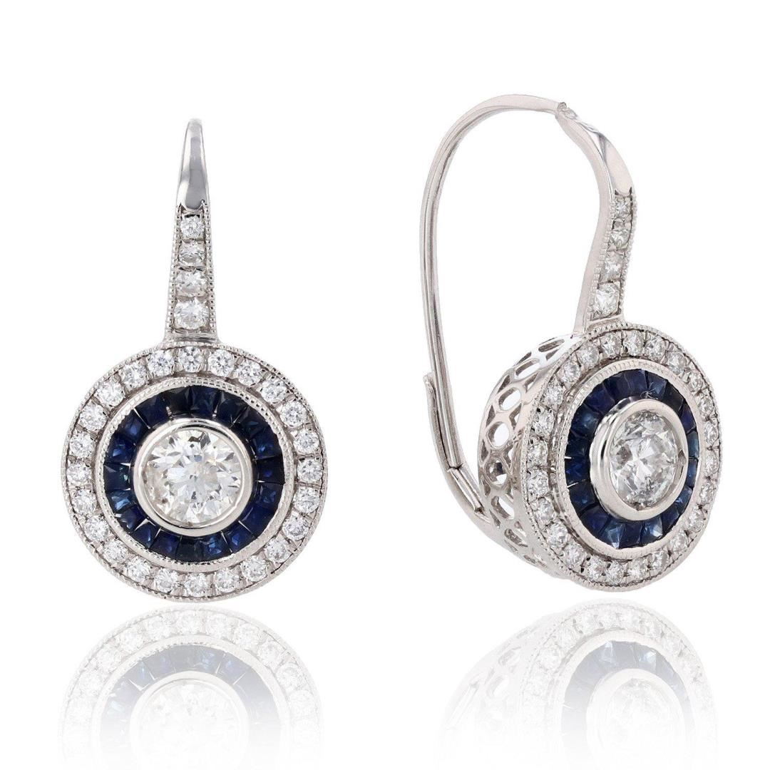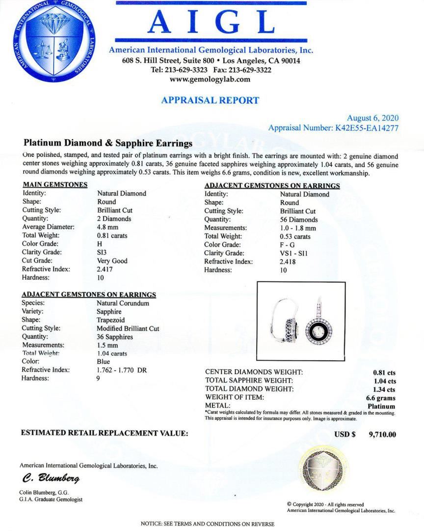 One polished, stamped, and tested pair of platinum earrings with a bright finish. The earrings are mounted with: 2 genuine diamond center stones weighing approximately 0.81 carats, 36 genuine faceted sapphires weighing approximately 1.04 carats, and 56 genuine round diamonds weighing approximately 0.53 carats. This item weighs 6.6 grams, condition is new, excellent workmanship. MAIN GEMSTONES Identity: Natural Diamond Shape: Round Cutting Style: Brilliant Cut Quantity: 2 Diamonds Average Diameter: 4.8mm Total Weight: 0.81 carats Color Grade: H Clarity Grade: SI3 Cut Grade: Very Good Refractive Index: 2.417 Hardness: 10 ADJACENT GEMSTONES ON EARRINGS Identity: Natural Diamond Shape: Round Cutting Style: Brilliant Cut Quantity: 56 Diamonds Measurements: 1.0mm to 1.8mm Total Weight: 0.53 carats Color Grade: F - G Clarity Grade: VS1 to SI1 Refractive Index: 2.418 Hardness: 10 ADJACENT GEMSTONES ON EARRINGS Species: Natural Corundum Variety: Sapphire Shape: Trapezoid Cutting Style: Modified Brilliant Cut Quantity: 36 Sapphires Measurements: 1.5mm Total Weight: 1.04 carats Color: Blue Refractive Index: 1.762 - I.770 DR Hardness: 9 CENTER DIAMONDS WEIGHT: 0.81 cts TOTAL SAPPHIRE WEIGHT: 1.04 cts TOTAL DIAMOND WEIGHT: 1.34 cts WEIGHT OF ITEM: 6.6 grams METAL: Platinum #LREF-4355