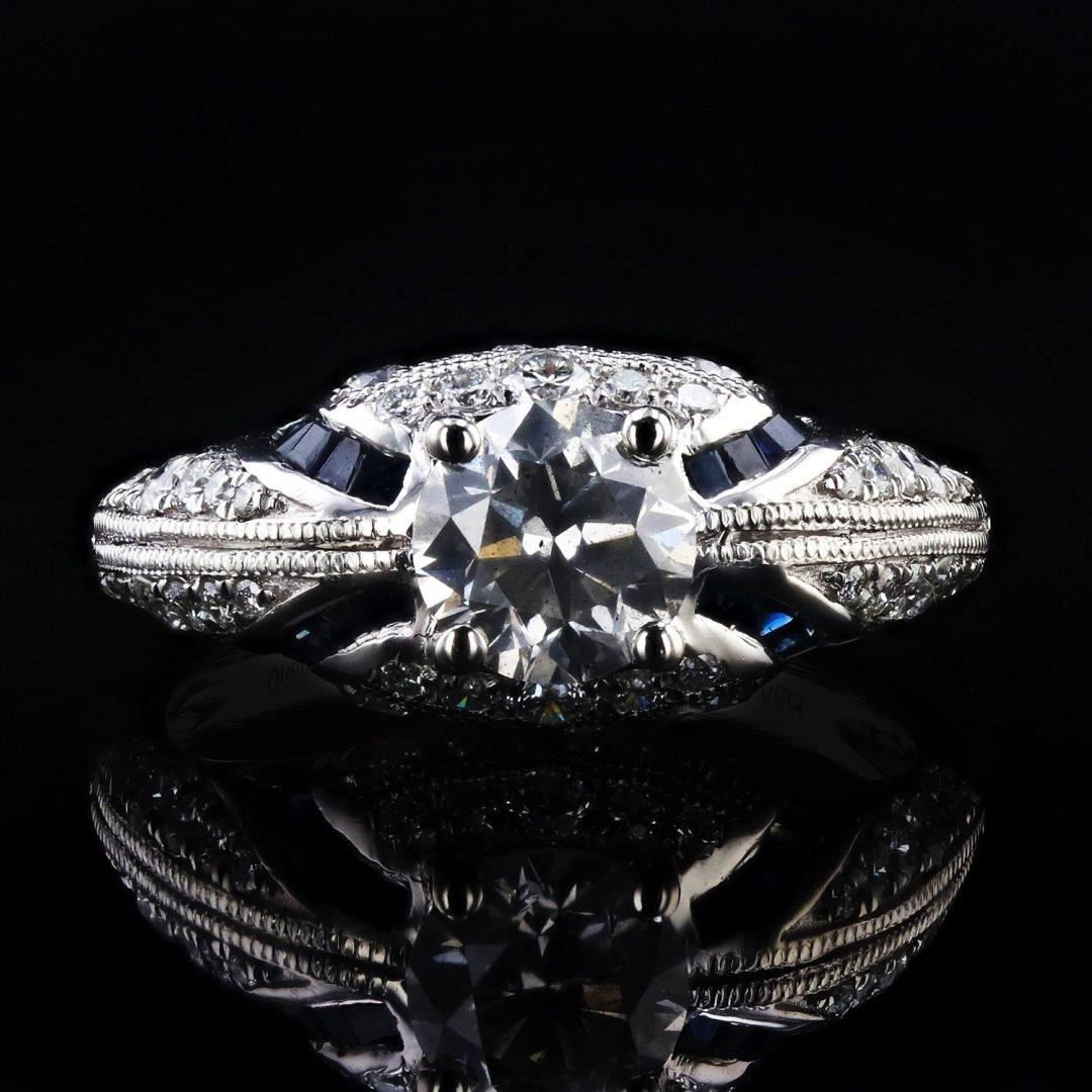 Platinum Diamond & Sapphire Ring One polished, stamped, and tested platinum ring with a bright finish. The ring is mounted with 1 genuine diamond center stone weighing approximately 1.04 carat, 20 genuine faceted sapphires weighing approximately 0.95 carats, and 46 genuine round diamonds weighing approximately 0.44 carats. This item weighs 6.6 grams, condition is new, excellent workmanship. *MAIN GEMSTONE* Identity: Natural Diamond; Shape: Round; Cutting Style: Brilliant Cut; Average Diameter: 6.25mm; Depth: 4.05mm; Weight: 1.04 carat; Color Grade: I; Clarity Grade: I1; Polish: Very Good; Symmetry: Very Good; Refractive Index: 2.417; Hardness: 10; *ADJACENT GEMSTONES ON RING* Identity: Natural Diamond; Shape: Round; Cutting Style: Brilliant Cut; Quantity: 46 Diamonds; Measurement: 1.0 - 1.8mm; Total Weight: 0.44 carats; Color Grade: F - G; Clarity Grade: VS2 - SI1; Refractive Index: 2.418; Hardness: 10; *ADJACENT GEMSTONES ON RING* Species: Natural Corundum; Variety: Sapphire; Shape: Square/Trapezoid; Cutting Style: Step Cut; Quantity: 20; Sapphires Measurements: 1.5mm; Total Weight: 0.95 carats; Color: Blue; Refractive Index: 1.762 - 1770 DR; Birefringence: 0.008 - 0.010; Hardness: 9 #Size: 6.75