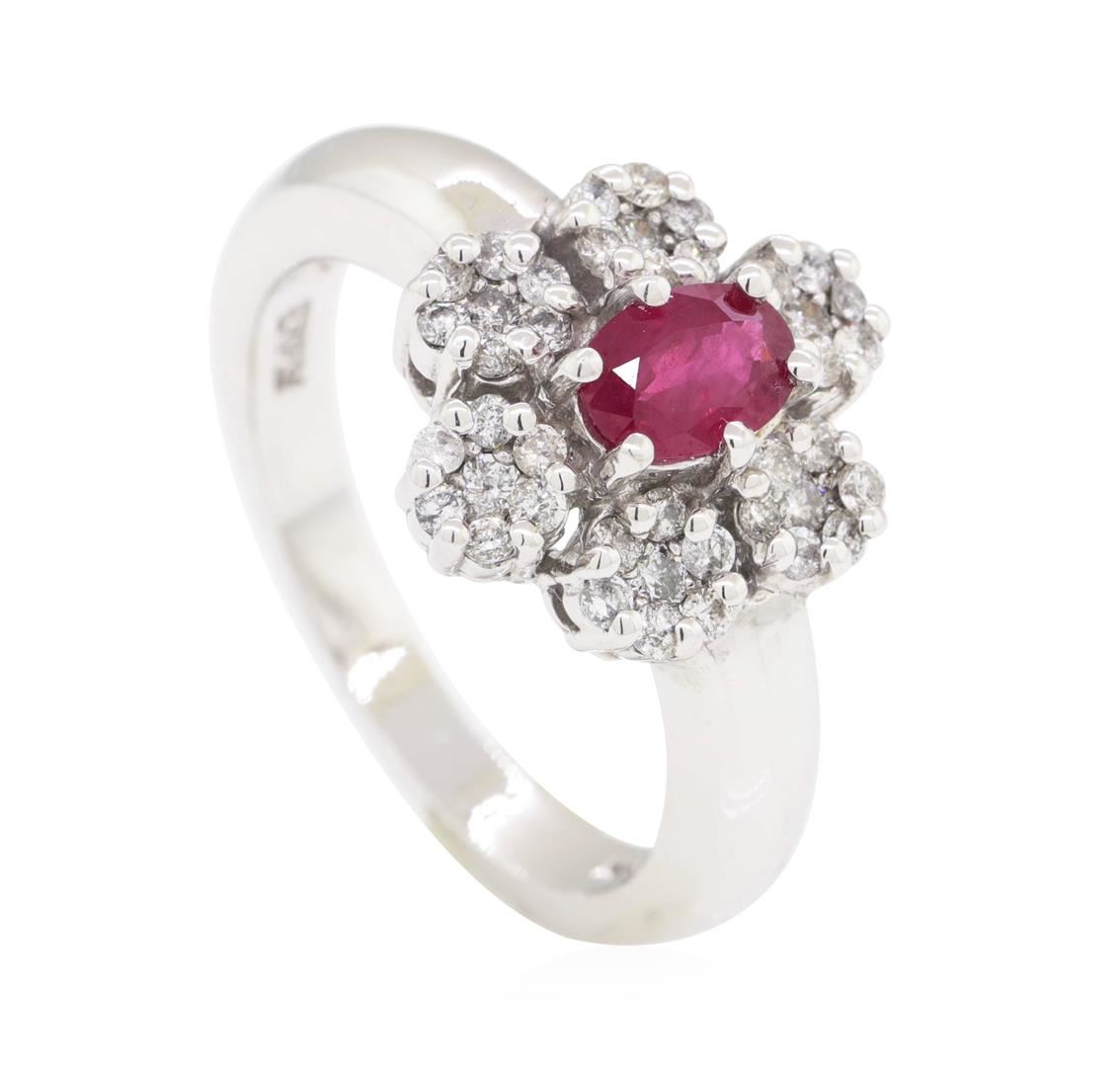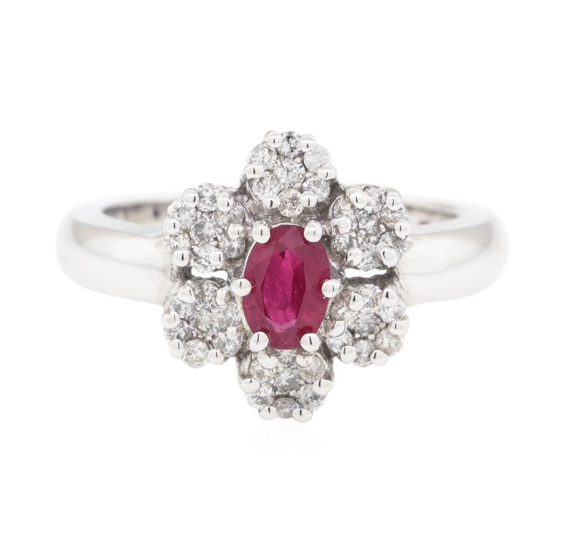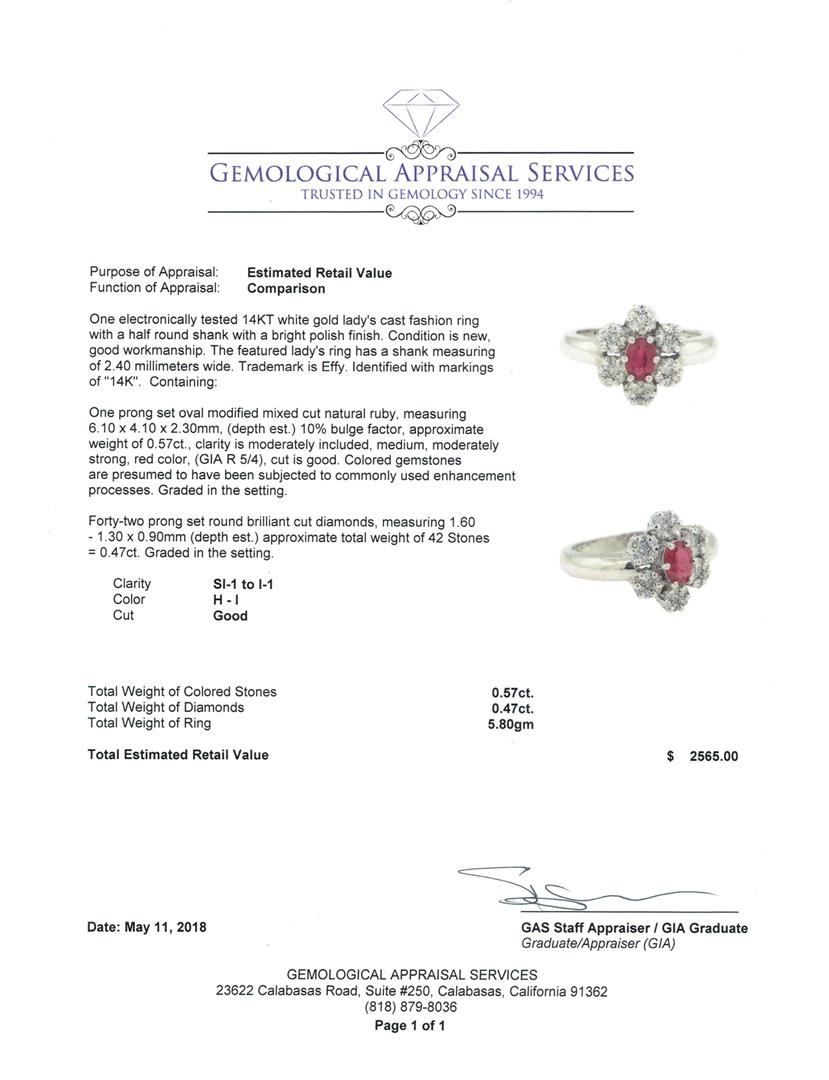 One electronically tested 14KT white gold lady's cast fashion ring with a half round shank with a bright polish finish. The featured lady's ring has a shank measuring of 2.40 millimeters wide. Trademark is Effy. Identified with markings of '14K'. Condition is new, good workmanship. Containing: One prong set oval modified mixed cut natural ruby, measuring 6.10 x 4.10 x 2.30mm, (depth est.) 10%. bulge factor, approximate weight of 0.57ct., clarity is moderately included, medium, moderately strong, red color, (GIA R 5/4), cut is good. Colored gemstones are presumed to have been subjected to commonly used enhancement processes. Graded in the setting. Forty-Two prong set round brilliant cut diamonds, measuring 1.60 - 1.30 x 0.90mm (depth est.) approximate total weight of 42 Stones = 0.47ct. Graded in the setting. Color H - I Clarity SI-1 to I-1 Cut Good. Total Weight of Colored Stones 0.57ct.. Total Weight of Diamonds 0.47ct.. Total Weight of Ring 5.80gm GAS Appraised at $2565.00. GAS Appraised at $2,565.00.
