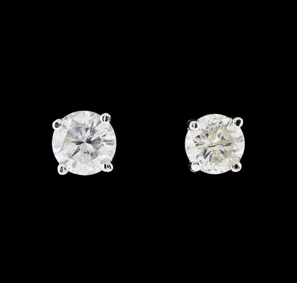 One pair electronically tested 14KT white gold lady's cast stud earrings with friction posts with a basket setting with a bright polish finish. Identified with markings of '14K'. Condition is new, good workmanship. Containing: One prong set round brilliant cut diamond, measuring 5.08 - 5.05 x 3.40mm (depth est.) approximate weight of 0.55ct. Graded in the setting. Clarity I-2. Color: H Cut Good One prong set round brilliant cut diamond, measuring 4.75 - 4.71 x 3.10mm (depth est.) , 10.00.%. GTCF approximate weight of 0.49ct. Graded in the setting. Clarity I-2. Color: J Cut Good. Total Weight of Diamonds 1.04ct.. Total Weight of Earrings 1.00gm. GAS Appraised at $3,910.00.