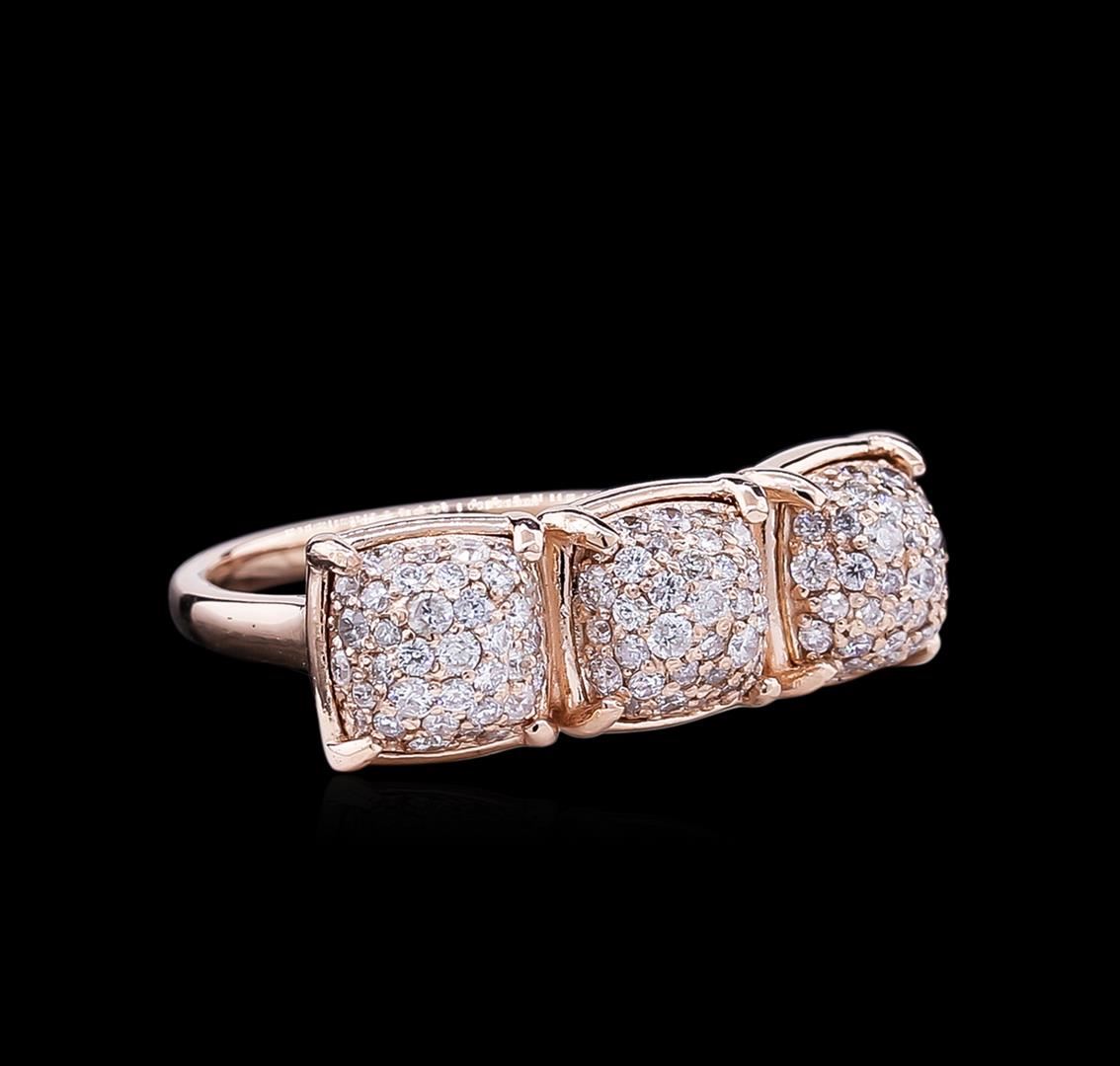One electronically tested 14KT rose gold lady's cast fashion ring with a bright polish finish. The featured lady's ring has a shank measuring 1.95 millimeters wide. Identified with markings of "585". Condition is new, good workmanship. Containing: Seventy-Five prong set round brilliant cut diamonds, measuring 1.30 - 1.25 x 0.82mm (depth est.) approximate total weight of 75 Stones = 0.62ct. Graded in the setting. Clarity: SI-1 to I-1. Color: H - I. Cut Good Thirty prong set round brilliant cut diamonds, measuring 1.60 - 1.50 x 0.95mm (depth est.) approximate total weight of 30 Stones = 0.42ct. Graded in the setting. Clarity: SI-1 to I-1. Color: H - I. Cut Good. Total Weight of Diamonds 1.04ct. Total Weight of Ring 6.30gm. GAS Appraised at $4,365.00.