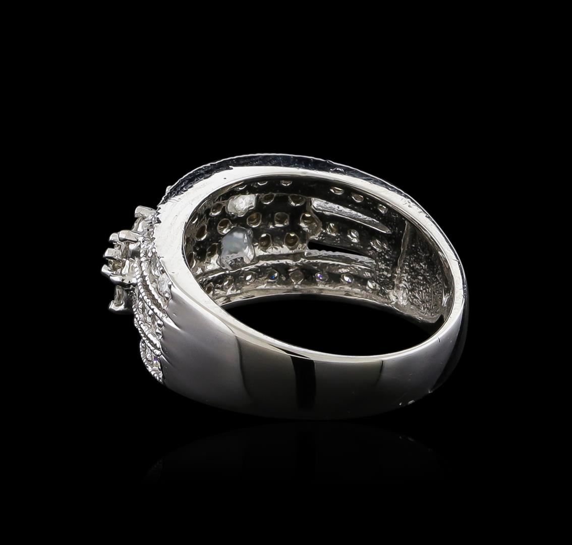 One electronically tested 14KT white gold lady's cast fashion ring with a tapered shank with a bright polish with milgrain detailing finish. The featured lady's ring has a shank measuring 4.49 millimeters wide. Identified with markings of "14K". Condition is new, good workmanship. Containing: Three prong set round brilliant cut diamonds, measuring 2.60 - 2.50 x 1.58mm (depth est.) approximate total weight of 3 Stones = 0.19ct. Graded in the setting. Clarity: SI-1 to I-1. Color: H - L. Cut Good Eighteen prong set round brilliant cut diamonds, measuring 1.80 - 1.70 x 1.05mm (depth est.) approximate total weight of 18 Stones = 0.35ct. Graded in the setting. Clarity: SI-1 to SI-2. Color: H - K. Cut Good Thirty-Six prong set round brilliant cut diamonds, measuring 1.60 - 1.50 x 0.96mm (depth est.) approximate total weight of 36 Stones = 0.50ct. Graded in the setting. Clarity: SI-1 to I-1. Color: H - I. Cut Good. Total Weight of Diamonds 1.04ct. Total Weight of Ring 6.40gm. GAS Appraised at $3,415.00.