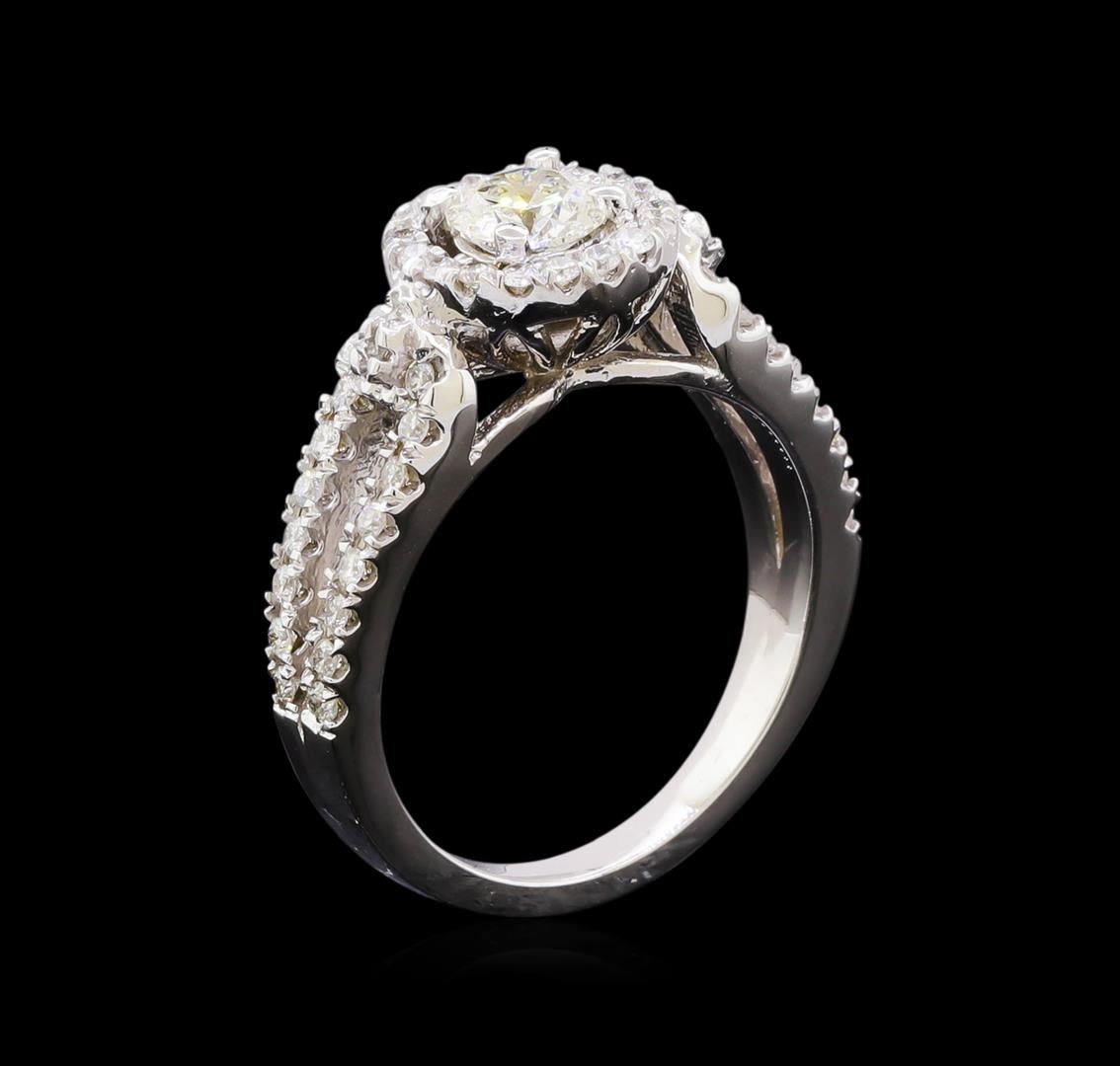 One electronically tested 14KT white gold lady's cast wedding ring with a basket halo with a bright polish finish. Featured lady's ring has a shank measuring 2.20 millimeters in width. Identified with markings of "14K". Condition is new, good workmanship. Containing: One prong set round brilliant cut diamond, measuring 5.14 - 5.11 x 3.18mm (depth est.) approximate weight of 0.52ct. Graded in the setting. Clarity: SI-2. Color: G. Cut Very Good Fifty-Six prong set round brilliant cut diamonds, measuring 1.40 - 1.30 x 0.84mm (depth est.) approximate total weight of 56 Stones = 0.52ct. Graded in the setting. Clarity: SI-1 to SI-2. Color: G - Good. Total Weight of Diamonds 1.04ct. Total Weight of Ring 5.50gm. GAS Appraised at $6,405.00.