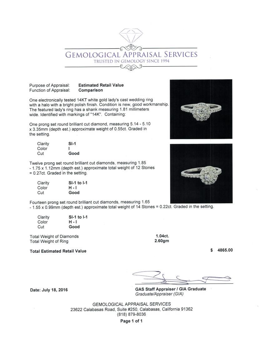 One electronically tested 14KT white gold lady's cast wedding ring with a halo with a bright polish finish. The featured lady's ring has a shank measuring 1.81 millimeters wide. Identified with markings of '14K'. Condition is new, good workmanship. Containing: One prong set round brilliant cut diamond, measuring 5.14 - 5.10 x 3.35mm (depth est.) approximate weight of 0.55ct. Graded in the setting. Clarity SI-1. Color: I Cut Good Twelve prong set round brilliant cut diamonds, measuring 1.85 - 1.75 x 1.12mm (depth est.) approximate total weight of 12 Stones = 0.27ct. Graded in the setting. Clarity SI-1 to I-1. Color: H - I Cut Good Fourteen prong set round brilliant cut diamonds, measuring 1.65 - 1.55 x 0.99mm (depth est.) approximate total weight of 14 Stones = 0.22ct. Graded in the setting. Clarity SI-1 to I-1. Color: H - I Cut Good. Total Weight of Diamonds 1.04ct.. Total Weight of Ring 2.60gm. GAS Appraised at $4,865.00.