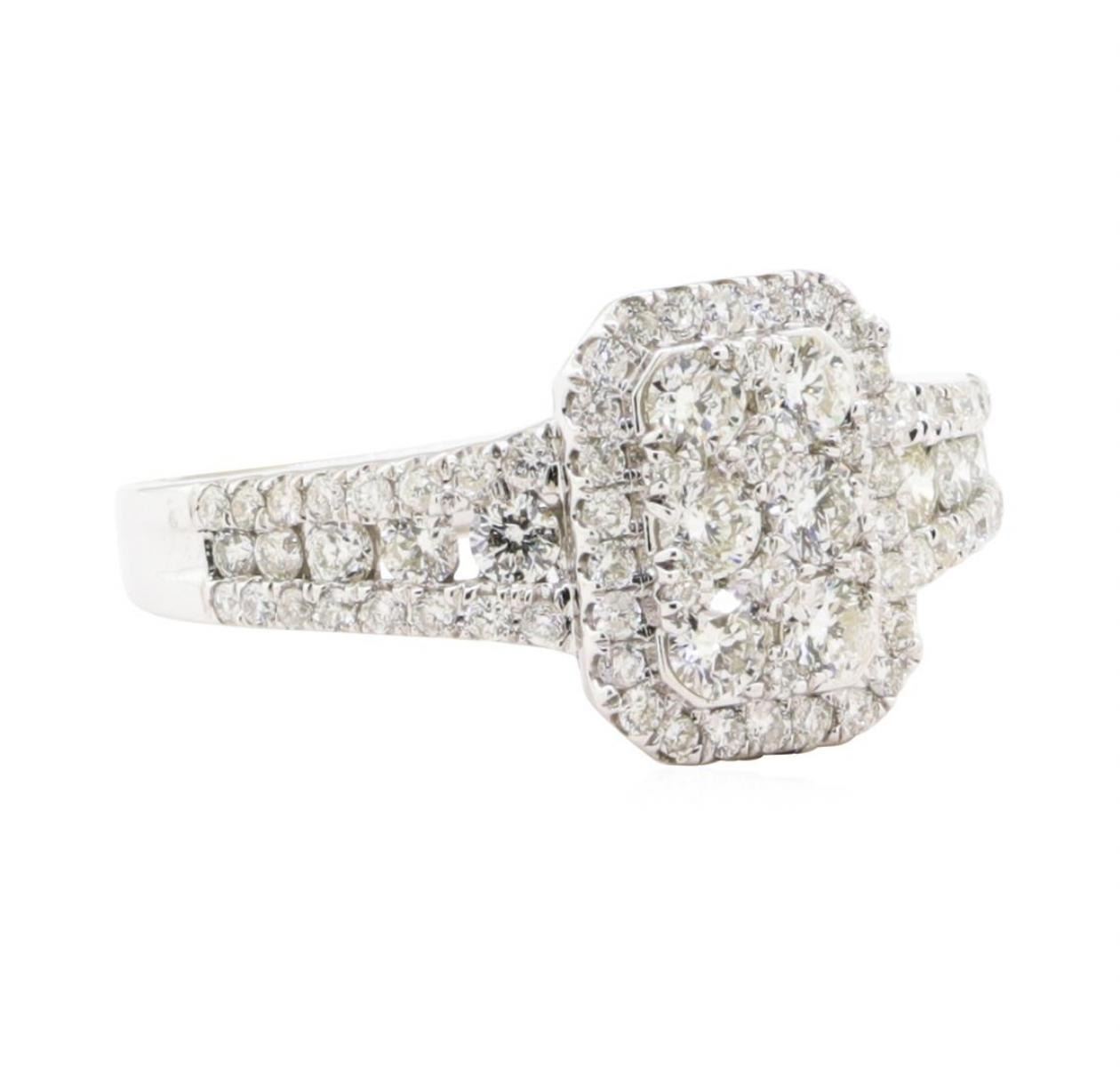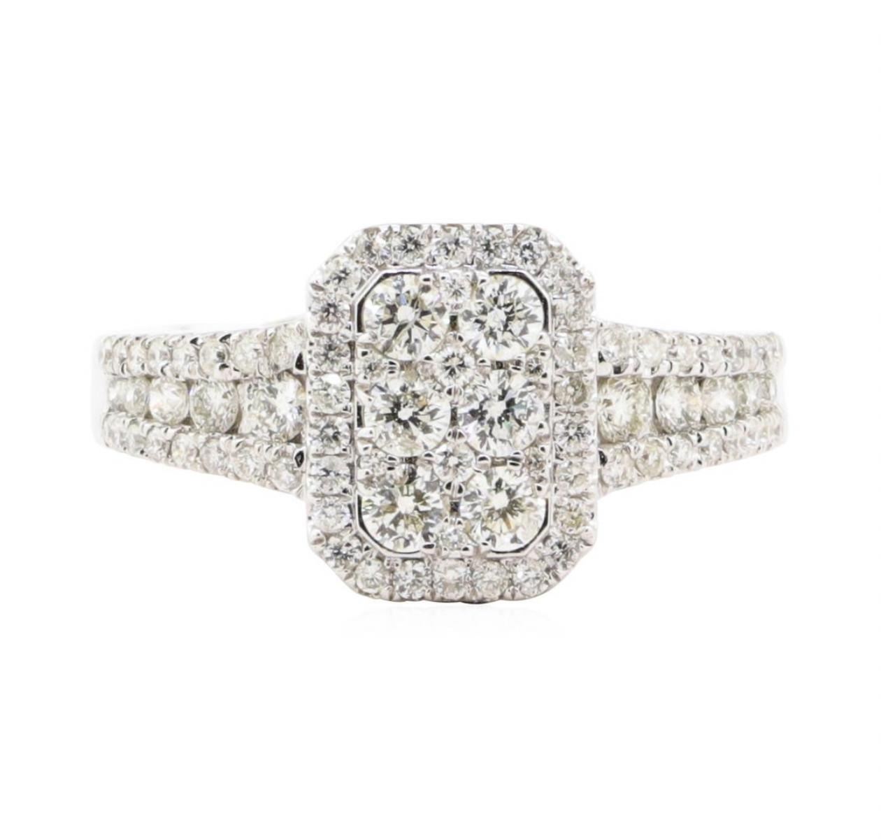 One electronically tested 14KT white gold lady's cast fashion ring with a rectangular halo with a bright polish finish. The featured lady's ring has a shank measuring 2.00 millimeters wide. Identified with markings of '14K'. Condition is new, good workmanship. Containing: Six prong set round brilliant cut diamonds, measuring 2.60 - 2.50 x 1.58mm (depth est.) approximate total weight of 6 Stones = 0.38ct. Graded in the setting. Color H - I Clarity SI-1 to I-1 Cut Very Good Ten channel set round brilliant cut diamonds, measuring 2.10 - 1.50 x 1.12mm (depth est.) approximate total weight of 10 Stones = 0.22ct. Graded in the setting. Color H - I Clarity SI-1 to SI-2 Cut Very Good Sixty-Six prong set round brilliant cut diamonds, measuring 1.30 - 1.00 x 0.71mm (depth est.) approximate total weight of 66 Stones = 0.44ct. Graded in the setting. Color H - I Clarity SI-1 to I-1 Cut Good. Total Weight of Diamonds 1.04ct.. Total Weight of Ring 3.40gm GAS Appraised at $3320.00. GAS Appraised.