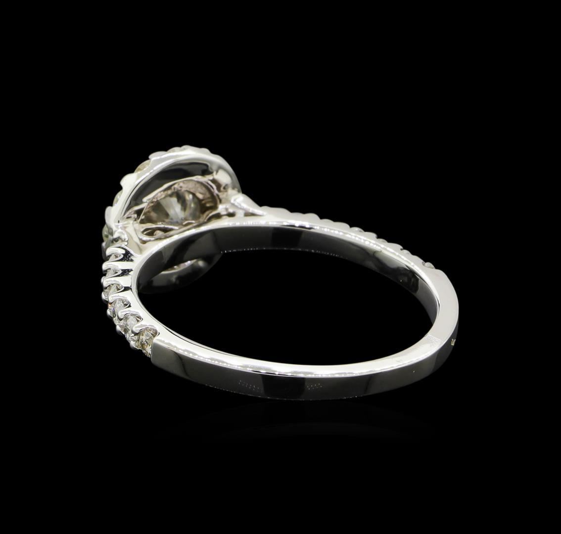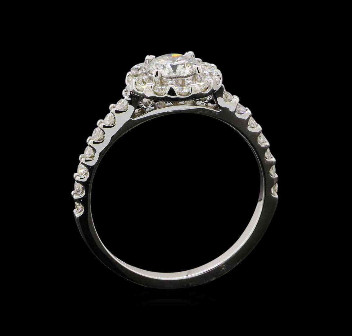 One electronically tested 14KT white gold lady's cast wedding ring with a halo with a bright polish finish. The featured lady's ring has a shank measuring 1.81 millimeters wide. Identified with markings of '14K'. Condition is new, good workmanship. Containing: One prong set round brilliant cut diamond, measuring 5.14 - 5.10 x 3.35mm (depth est.) approximate weight of 0.55ct. Graded in the setting. Clarity SI-1. Color: I Cut Good Twelve prong set round brilliant cut diamonds, measuring 1.85 - 1.75 x 1.12mm (depth est.) approximate total weight of 12 Stones = 0.27ct. Graded in the setting. Clarity SI-1 to I-1. Color: H - I Cut Good Fourteen prong set round brilliant cut diamonds, measuring 1.65 - 1.55 x 0.99mm (depth est.) approximate total weight of 14 Stones = 0.22ct. Graded in the setting. Clarity SI-1 to I-1. Color: H - I Cut Good. Total Weight of Diamonds 1.04ct.. Total Weight of Ring 2.60gm. GAS Appraised.