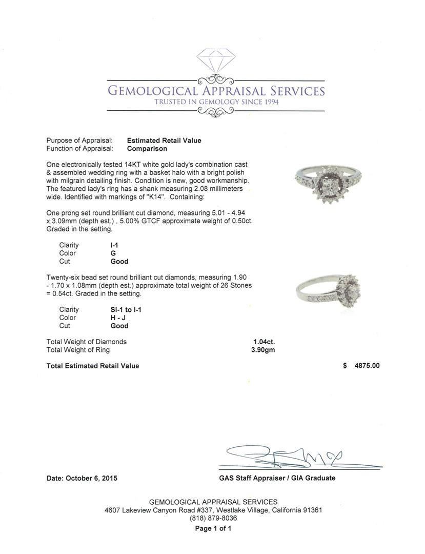 One electronically tested 14KT white gold lady's combination cast & assembled wedding ring with a basket halo with a bright polish with milgrain detailing finish. The featured lady's ring has a shank measuring 2.08 millimeters wide. Identified with markings of "K14". Condition is new, good workmanship. Containing: One prong set round brilliant cut diamond, measuring 5.01 - 4.94 x 3.09mm (depth est.) , 5.00.%. GTCF approximate weight of 0.50ct. Graded in the setting. Clarity: I-1. Color: G. Cut Good Twenty-Six bead set round brilliant cut diamonds, measuring 1.90 - 1.70 x 1.08mm (depth est.) approximate total weight of 26 Stones = 0.54ct. Graded in the setting. Clarity: SI-1 to I-1. Color: H - Good. Total Weight of Diamonds 1.04ct. Total Weight of Ring 3.90gm. GAS Appraised.