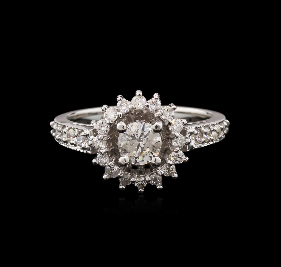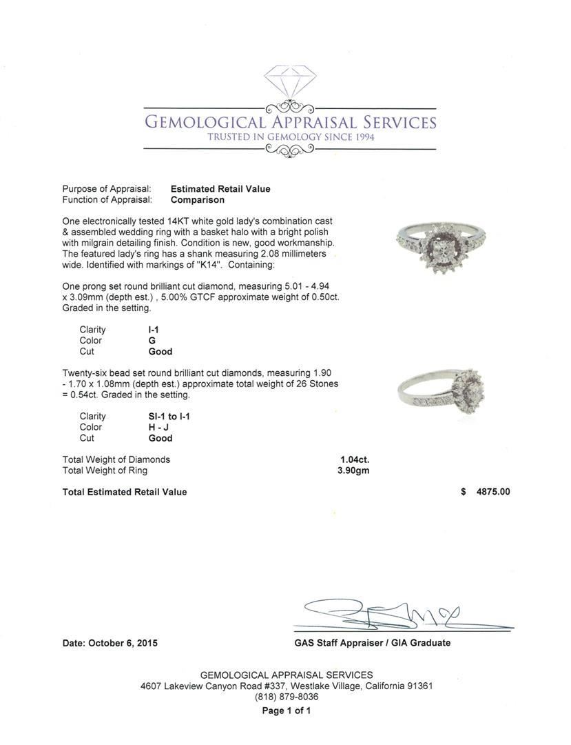 One electronically tested 14KT white gold lady's combination cast & assembled wedding ring with a basket halo with a bright polish with milgrain detailing finish. The featured lady's ring has a shank measuring 2.08 millimeters wide. Identified with markings of "K14". Condition is new, good workmanship. Containing: One prong set round brilliant cut diamond, measuring 5.01 - 4.94 x 3.09mm (depth est.) , 5.00.%. GTCF approximate weight of 0.50 ct. Graded in the setting. Clarity: I-1. Color: G. Cut Good Twenty-Six bead set round brilliant cut diamonds, measuring 1.90 - 1.70 x 1.08mm (depth est.) approximate total weight of 26 Stones = 0.54ct. Graded in the setting. Clarity: SI-1 to I-1. Color: H - Good. Total Weight of Diamonds 1.04ct. Total Weight of Ring 3.90gm. GAS Appraised.