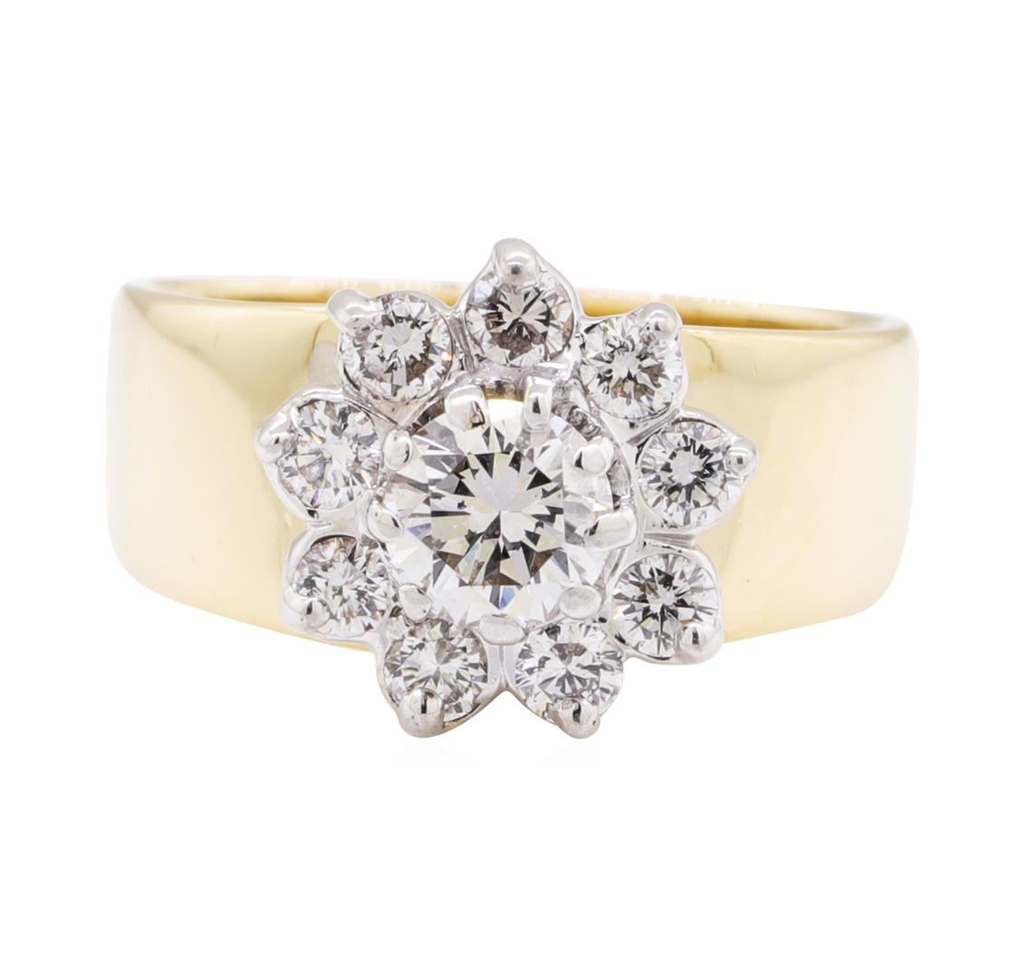 One electronically tested 14KT yellow and white gold lady's combination cast & assembled fashion ring with a basket halo with a bright polish finish. The featured lady's ring has a shank measuring 4.90 millimeters wide. Identified with markings of '14K'. Condition is used, good workmanship. Containing: One prong set round brilliant cut diamond, measuring 5.20 - 5.13 x 3.21mm (depth est.) approximate weight of 0.52ct. Graded in the setting. Color G Clarity VS-1 Cut Good Nine prong set round brilliant cut diamonds, measuring 2.50 - 2.45 x 1.54mm (depth est.) approximate total weight of 9 Stones = 0.52ct. Graded in the setting. Color G - H Clarity VS-2 to I-1 Cut Very Good. Total Weight of Diamonds 1.04ct.. Total Weight of Ring 6.00gm GAS Appraised at $6450.00. GAS Appraised at $6,450.00.