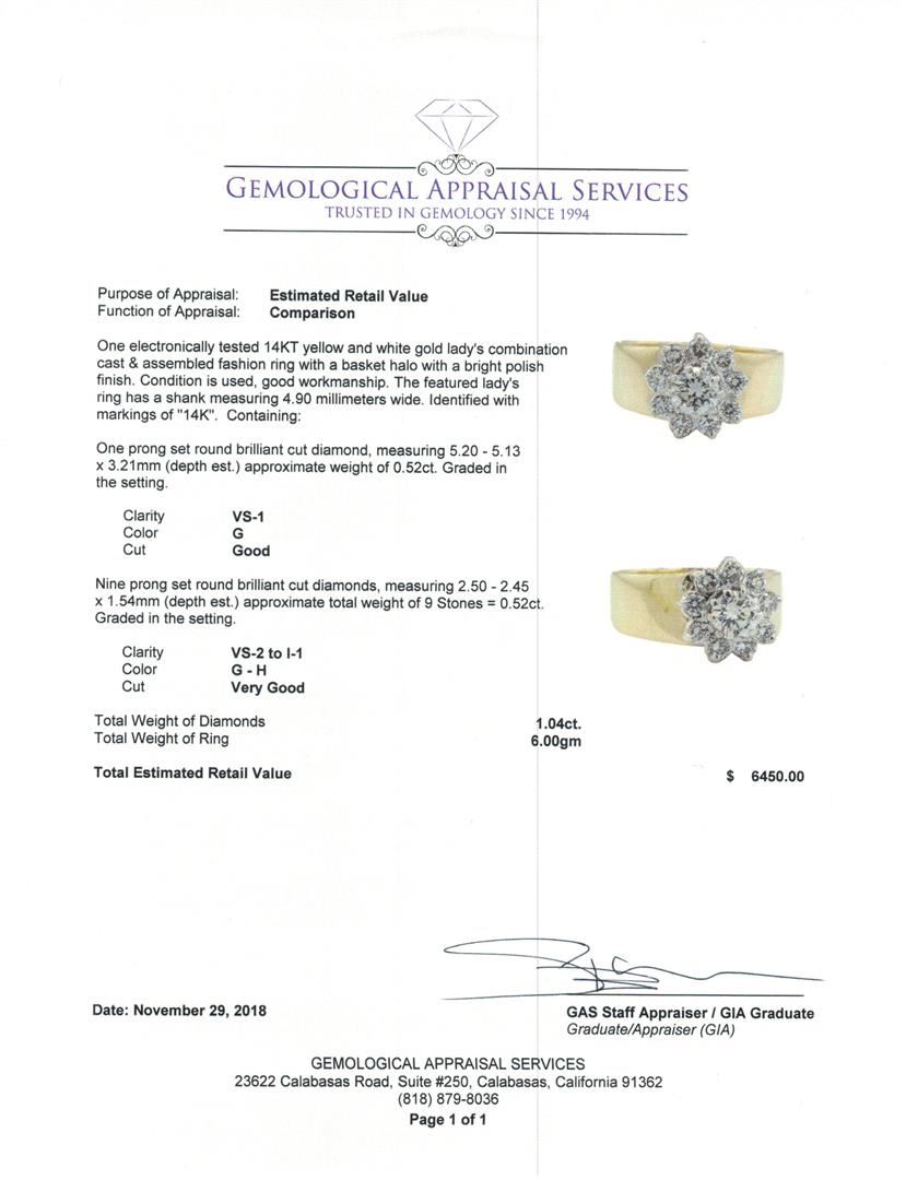 One electronically tested 14KT yellow and white gold lady's combination cast & assembled fashion ring with a basket halo with a bright polish finish. The featured lady's ring has a shank measuring 4.90 millimeters wide. Identified with markings of '14K'. Condition is used, good workmanship. Containing: One prong set round brilliant cut diamond, measuring 5.20 - 5.13 x 3.21mm (depth est.) approximate weight of 0.52ct. Graded in the setting. Color G Clarity VS-1 Cut Good Nine prong set round brilliant cut diamonds, measuring 2.50 - 2.45 x 1.54mm (depth est.) approximate total weight of 9 Stones = 0.52ct. Graded in the setting. Color G - H Clarity VS-2 to I-1 Cut Very Good. Total Weight of Diamonds 1.04ct.. Total Weight of Ring 6.00gm GAS Appraised at $6450.00. GAS Appraised at $6,450.00.