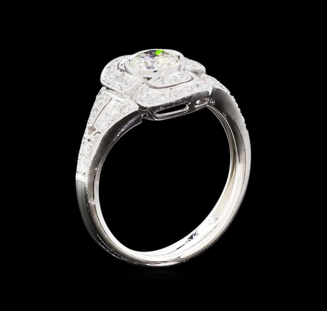 One electronically tested 18KT white gold lady's cast vintage fashion ring with a bright polish with milgrain detailing finish. The featured ladies ring has a shank that measures 3.00 millimeters. Trademark is MICHA. Identified with markings of "18K 750". Condition is new, good workmanship. Containing: One bezel set round brilliant cut diamond, measuring 5.80 - 5.75 x 3.27mm (depth est.) approximate weight of 0.62ct. Graded in the setting. Clarity: SI-2. Color: I - Very Good Forty-Two prong set round brilliant cut diamonds, measuring 1.40 - 1.30 x 0.85mm (depth est.) approximate total weight of 42 Stones = 0.42ct. Graded in the setting. Clarity: VS-2 to SI-1. Color: H - I. Cut Good. Total Weight of Diamonds 1.04ct. Total Weight of Ring 5.30gm. GAS Appraised at $6,735.00.
