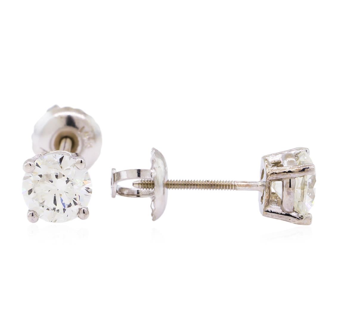 One pair electronically tested 14KT white gold lady's combination cast & assembled stud earrings with threaded posts and screw-on/screw-off backs with a bright polish finish. Identified with markings of "14K". Condition is new, good workmanship. Containing: Two prong set round brilliant cut diamonds, measuring 5.03 - 4.87 x 3.17mm (depth est.) approximate total weight of 2 Stones = 1.04ct. Graded in the setting. Clarity: SI-1 to I-1. Color: F - G. Cut Very Good. Total Weight of Diamonds 1.04ct. Total Weight of Earrings 1.00gm. GAS Appraised at $7,050.00.