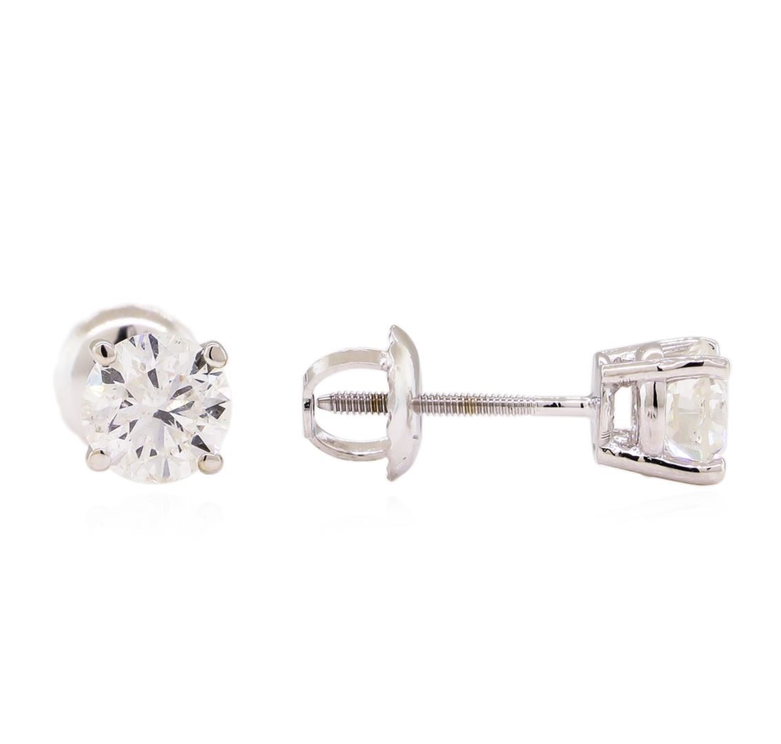 One pair electronically tested 14KT white gold lady's combination cast & assembled stud earrings with threaded posts and screw-on/screw-off backs with a bright polish finish. Identified with markings of "14K". Condition is new, good workmanship. Containing: Two prong set round brilliant cut diamonds, measuring 5.17 - 4.95 x 3.29mm (depth est.) approximate total weight of 2 Stones = 1.04ct. Graded in the setting. Clarity: SI-1 to SI-2. Color: G - Very Good. Total Weight of Diamonds 1.04ct. Total Weight of Earrings 1.00gm. GAS Appraised at $7,365.00.