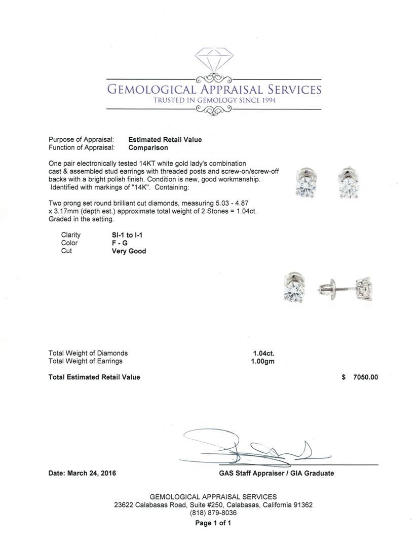 One pair electronically tested 14KT white gold lady's combination cast & assembled stud earrings with threaded posts and screw-on/screw-off backs with a bright polish finish. Identified with markings of "14K". Condition is new, good workmanship. Containing: Two prong set round brilliant cut diamonds, measuring 5.03 - 4.87 x 3.17mm (depth est.) approximate total weight of 2 Stones = 1.04ct. Graded in the setting. Clarity: SI-1 to I-1. Color: F - G. Cut Very Good. Total Weight of Diamonds 1.04ct. Total Weight of Earrings 1.00gm. GAS Appraised at $7,050.00.