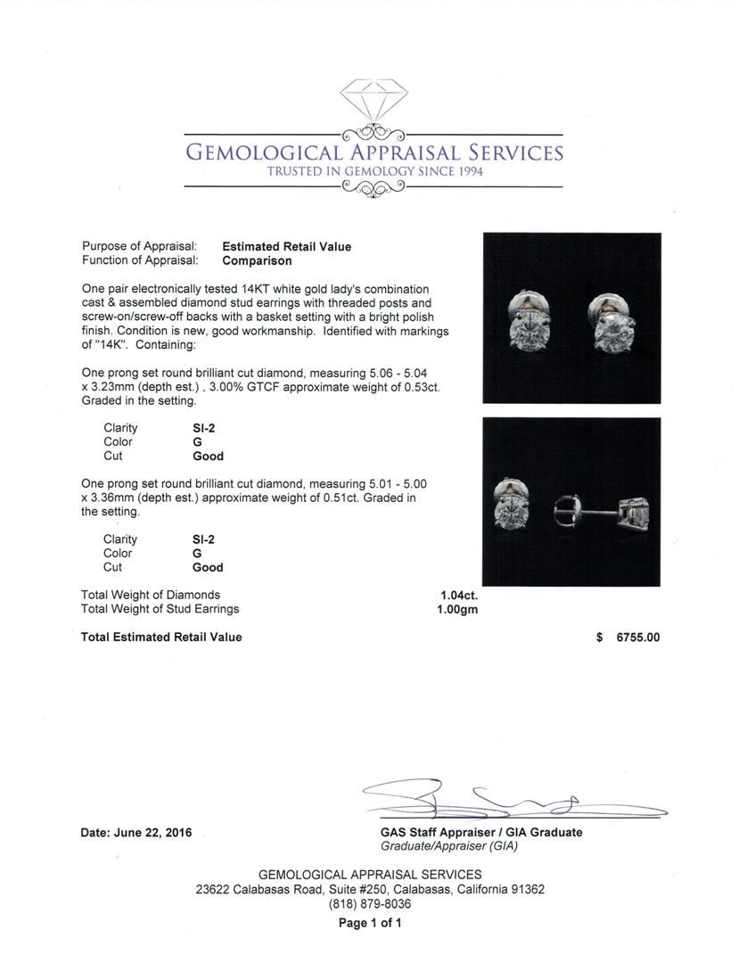 One pair electronically tested 14KT white gold lady's combination cast & assembled diamond stud earrings with threaded posts and screw-on/screw-off backs with a basket setting with a bright polish finish. Identified with markings of "14K". Condition is new, good workmanship. Containing: One prong set round brilliant cut diamond, measuring 5.06 - 5.04 x 3.23mm (depth est.) , 3.00.%. GTCF approximate weight of 0.53ct. Graded in the setting. Clarity: SI-2. Color: Good One prong set round brilliant cut diamond, measuring 5.01 - 5.00 x 3.36mm (depth est.) approximate weight of 0.51ct. Graded in the setting. Clarity: SI-2. Color: Good. Total Weight of Diamonds 1.04ct. Total Weight of Stud Earrings 1.00gm. GAS Appraised at $6,755.00.