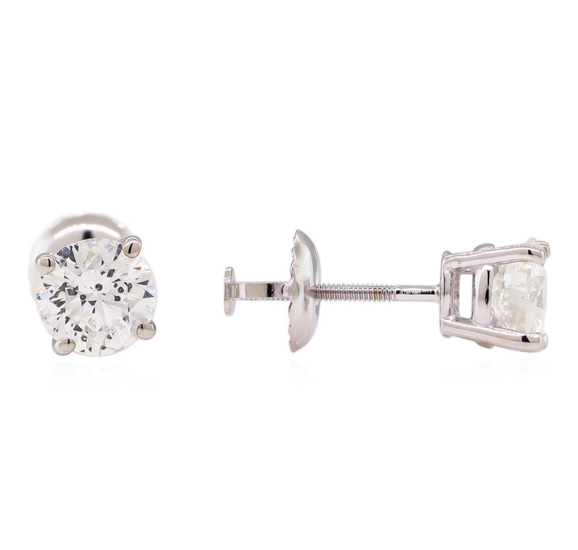 One pair electronically tested 14KT white gold lady's combination cast & assembled stud earrings with threaded posts and screw-on/screw-off backs with a bright polish finish. Identified with markings of "14K". Condition is new, good workmanship. Containing: Two prong set round brilliant cut diamonds, measuring 5.16 - 5.10 x 3.23mm (depth est.) approximate total weight of 2 Stones = 1.04ct. Graded in the setting. Clarity: SI-2. Color: H - I. Cut Very Good. Total Weight of Diamonds 1.04ct. Total Weight of Earrings 1.00gm. GAS Appraised at $7,050.00.