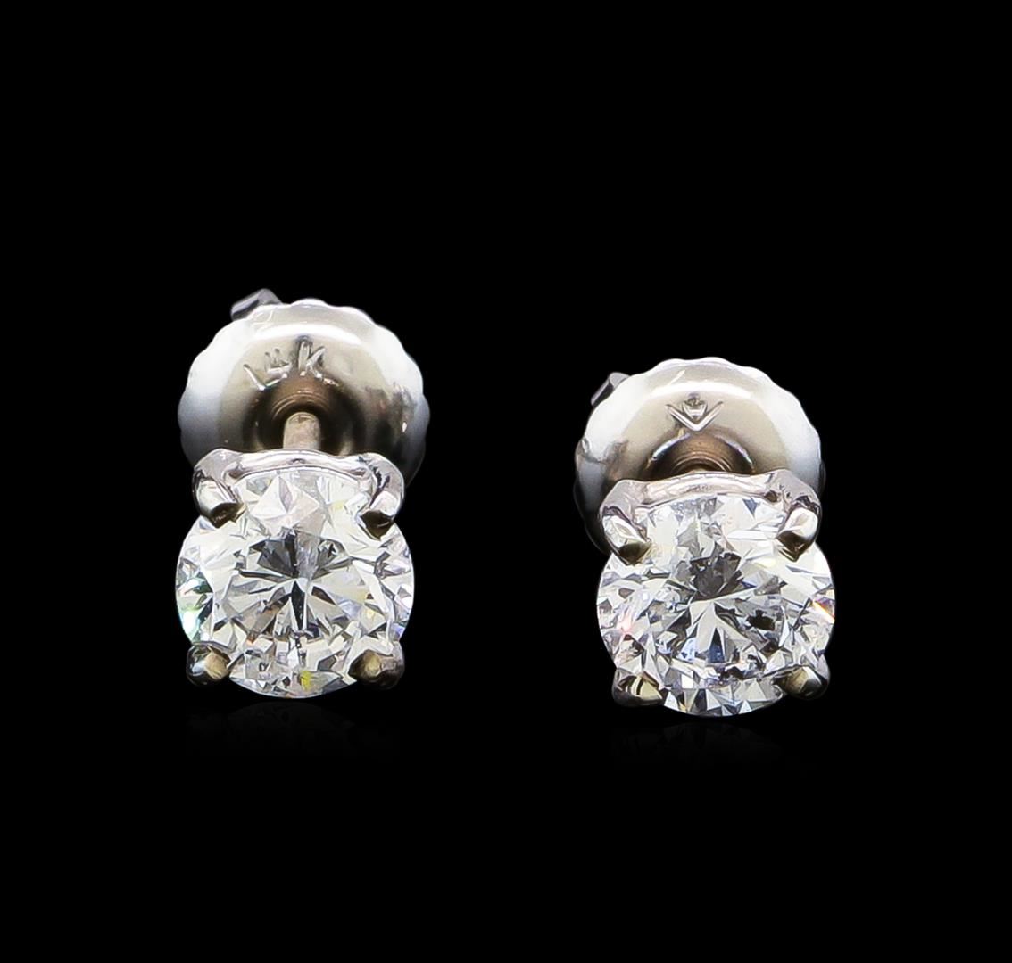 One pair electronically tested 14KT white gold lady's combination cast & assembled diamond stud earrings with threaded posts and screw-on/screw-off backs with a basket setting with a bright polish finish. Identified with markings of "14K". Condition is new, good workmanship. Containing: One prong set round brilliant cut diamond, measuring 5.04 - 5.01 x 3.37mm (depth est.) approximate weight of 0.53ct. Graded in the setting. Clarity: I-1. Color: Good One prong set round brilliant cut diamond, measuring 4.99 - 4.98 x 3.36mm (depth est.) approximate weight of 0.51ct. Graded in the setting. Clarity: SI-3. Color: Good. Total Weight of Diamonds 1.04ct. Total Weight of Stud Earrings 1.00gm. GAS Appraised at $5,495.00.