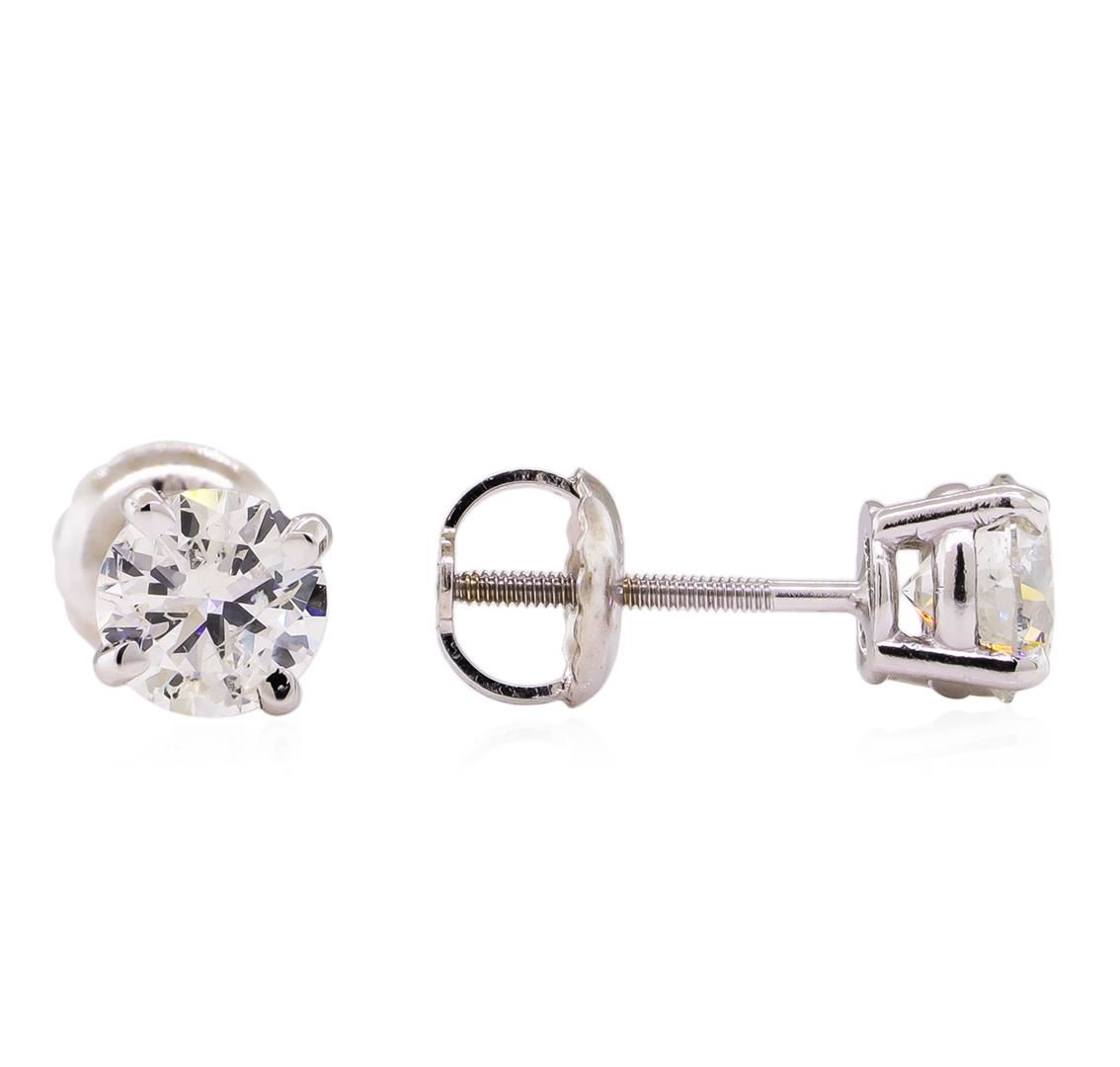 One pair electronically tested 14KT white gold lady's combination cast & assembled stud earrings with threaded posts and screw-on/screw-off backs with a bright polish finish. Identified with markings of "14K". Condition is new, good workmanship. Containing: Two prong set round brilliant cut diamonds, measuring 5.13 - 5.08 x 3.24mm (depth est.) approximate total weight of 2 Stones = 1.04ct. Graded in the setting. Clarity: SI-2. Color: G - I. Cut Very Good. Total Weight of Diamonds 1.04ct. Total Weight of Earrings 1.00gm. GAS Appraised at $7,210.00.