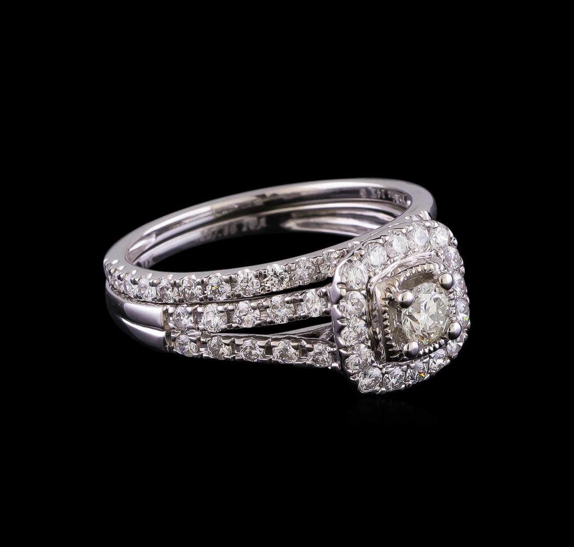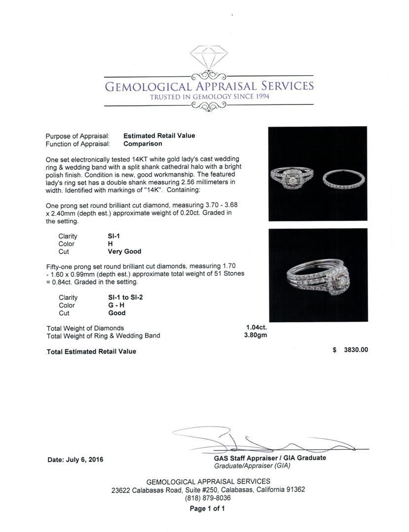 One set electronically tested 14KT white gold lady's cast wedding ring & wedding band with a split shank cathedral halo with a bright polish finish. The featured lady's ring set has a double shank measuring 2.56 millimeters in width. Identified with markings of '14K'. Condition is new, good workmanship. Containing: One prong set round brilliant cut diamond, measuring 3.70 - 3.68 x 2.40mm (depth est.) approximate weight of 0.20ct. Graded in the setting. Clarity SI-1. Color: H Cut Very Good Fifty-One prong set round brilliant cut diamonds, measuring 1.70 - 1.60 x 0.99mm (depth est.) approximate total weight of 51 Stones = 0.84ct. Graded in the setting. Clarity SI-1 to SI-2. Color: G - H Cut Good. Total Weight of Diamonds 1.04ct.. Total Weight of Ring & Wedding Band 3.80gm. GAS Appraised at $3,830.00.