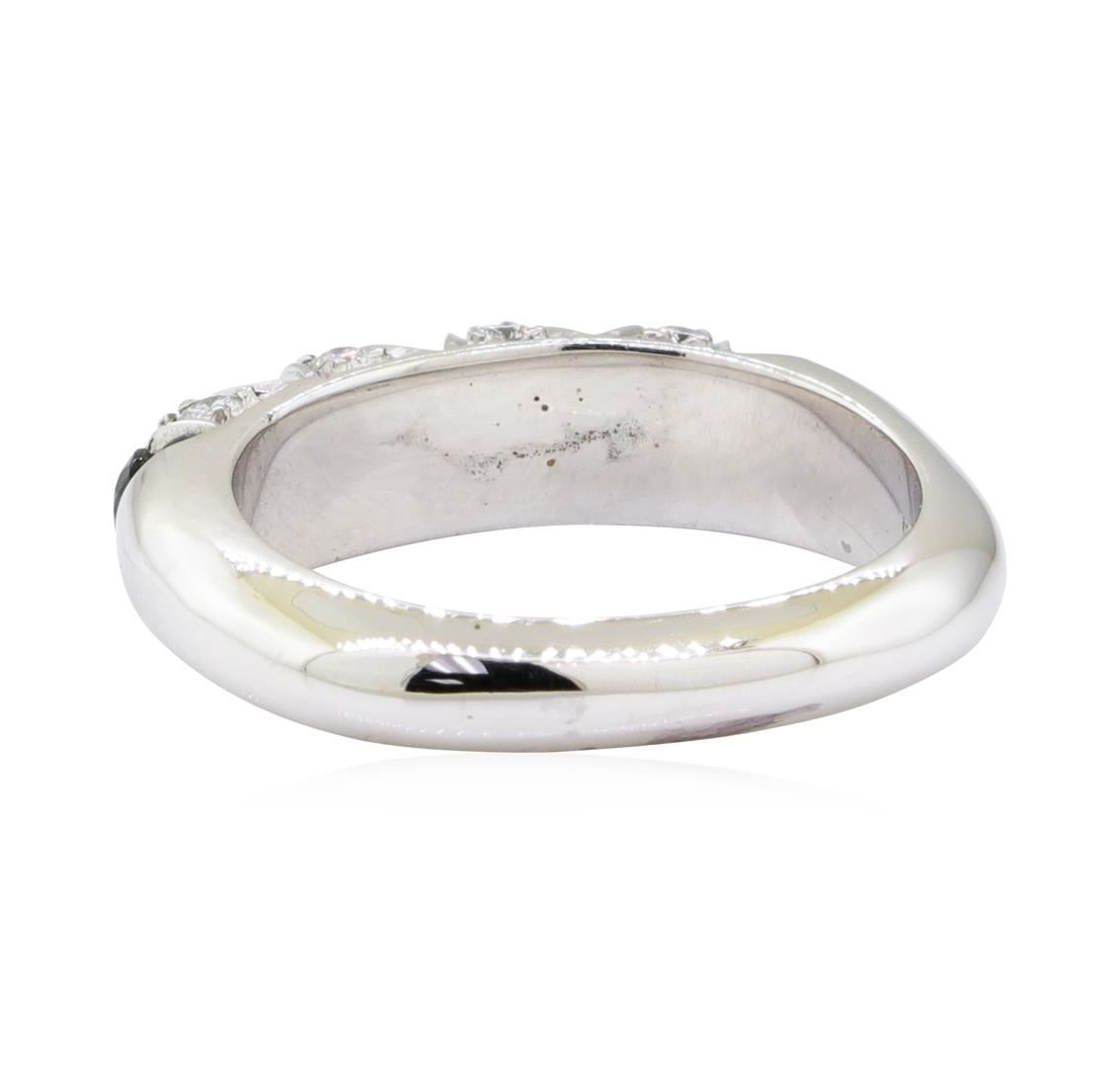 One electronically tested 14KT white gold lady's cast fashion ring with a five stone straight line motif with a bright polish finish. The featured lady's ring has a European shank measuring 3.50 millimeters wide. Identified with markings of '14K'. Condition is new, good workmanship. Containing: Five channel set round modified mixed cut natural green tourmalines, measuring 3.08 - 3.00 x 2.40 mm, (depth est.) approximate total weight of 0.70ct., clarity is eye clean, medium, moderately strong, very slightly bluish green color, (GIA vslbG 5/4), cut is very good. Transmitting light with no distortion, transparent. Colored gemstones are presumed to have been subjected to commonly used enhancement processes. Graded in the setting. Eight prong set round brilliant cut diamonds, measuring 2.00 - 1.95 x 1.19mm (depth est.) approximate total weight of 8 Stones = 0.23ct. Graded in the setting. Color G - I Clarity SI-1 to SI-2 Cut Good Eight prong set round brilliant cut diamonds, measuring 1.60 - 1.50 x 0.96mm (depth est.) approximate total weight of 8 Stones = 0.11ct. Graded in the setting. Color H - I Clarity SI-1 to SI-2 Cut Good. Total Weight of Colored Stones 0.70ct.. Total Weight of Diamonds 0.34ct.. Total Weight of Ring 6.40gm GAS Appraised at $2090.00. GAS Appraised at $2,090.00.