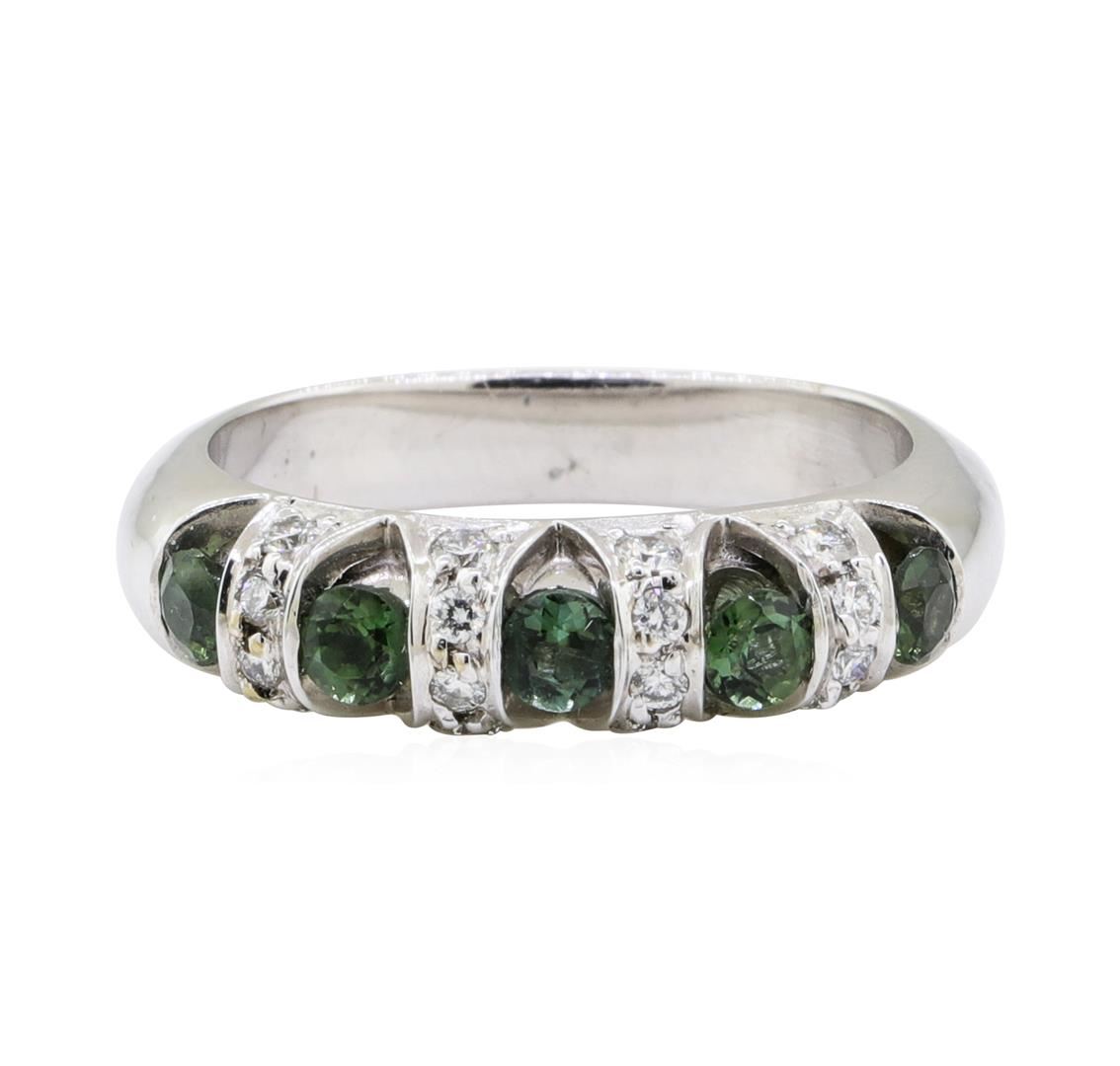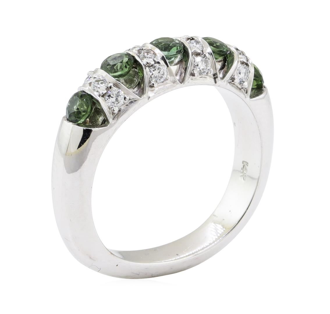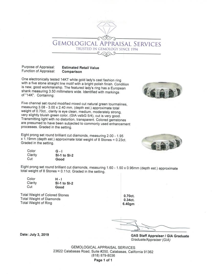 One electronically tested 14KT white gold lady's cast fashion ring with a five stone straight line motif with a bright polish finish. The featured lady's ring has a European shank measuring 3.50 millimeters wide. Identified with markings of '14K'. Condition is new, good workmanship. Containing: Five channel set round modified mixed cut natural green tourmalines, measuring 3.08 - 3.00 x 2.40 mm, (depth est.) approximate total weight of 0.70ct., clarity is eye clean, medium, moderately strong, very slightly bluish green color, (GIA vslbG 5/4), cut is very good. Transmitting light with no distortion, transparent. Colored gemstones are presumed to have been subjected to commonly used enhancement processes. Graded in the setting. Eight prong set round brilliant cut diamonds, measuring 2.00 - 1.95 x 1.19mm (depth est.) approximate total weight of 8 Stones = 0.23ct. Graded in the setting. Color G - I Clarity SI-1 to SI-2 Cut Good Eight prong set round brilliant cut diamonds, measuring 1.60 - 1.50 x 0.96mm (depth est.) approximate total weight of 8 Stones = 0.11ct. Graded in the setting. Color H - I Clarity SI-1 to SI-2 Cut Good. Total Weight of Colored Stones 0.70ct.. Total Weight of Diamonds 0.34ct.. Total Weight of Ring 6.40gm GAS Appraised at $2090.00. GAS Appraised at $2,090.00.