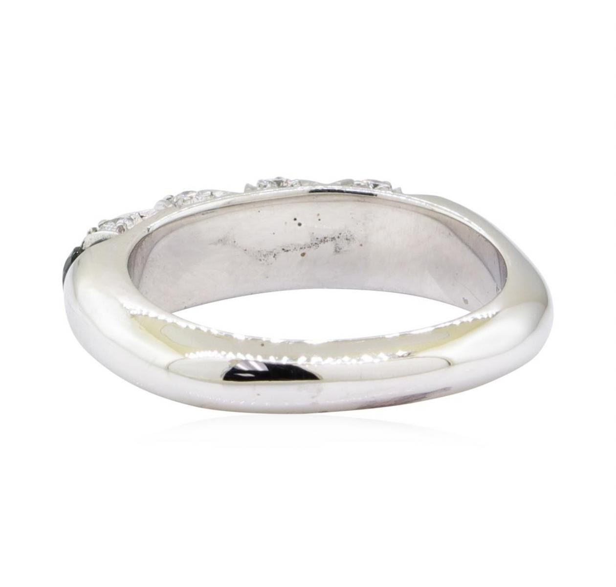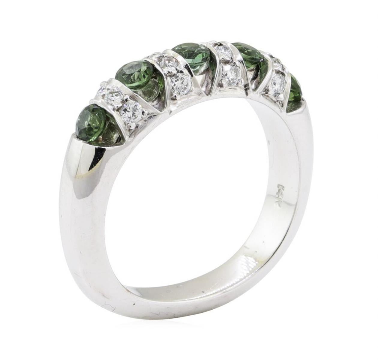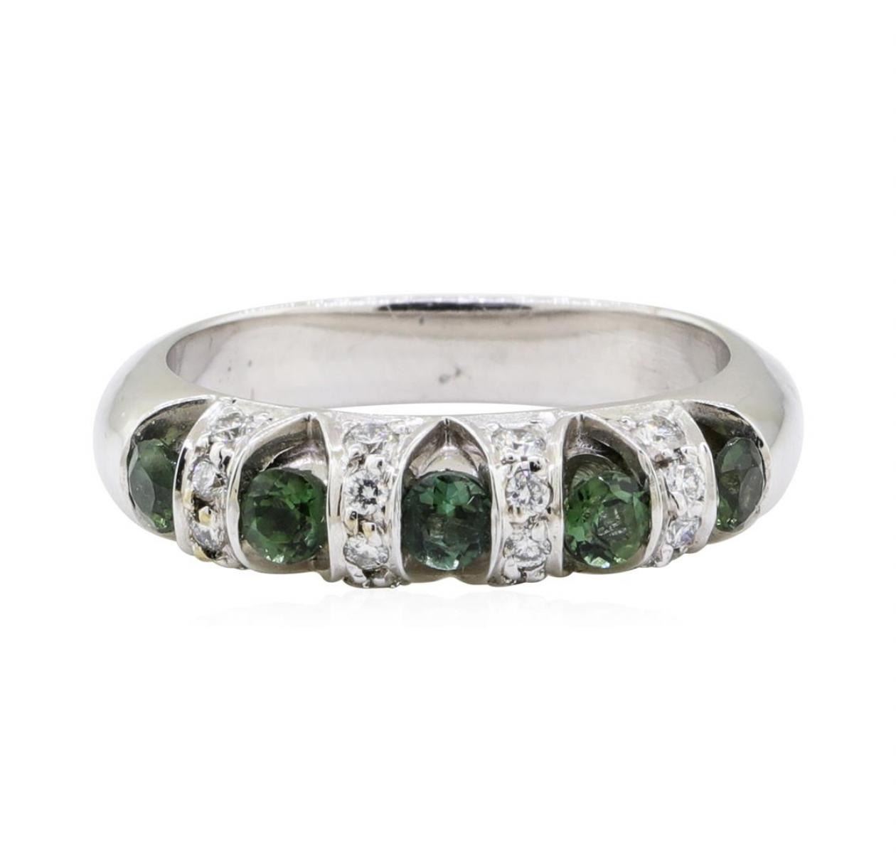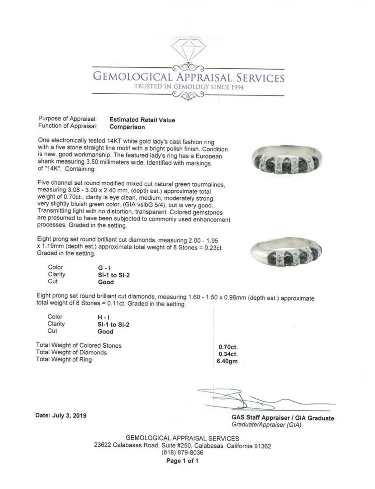 One electronically tested 14KT white gold lady's cast fashion ring with a five stone straight line motif with a bright polish finish. The featured lady's ring has a European shank measuring 3.50 millimeters wide. Identified with markings of '14K'. Condition is new, good workmanship. Containing: Five channel set round modified mixed cut natural green tourmalines, measuring 3.08 - 3.00 x 2.40 mm, (depth est.) approximate total weight of 0.70ct., clarity is eye clean, medium, moderately strong, very slightly bluish green color, (GIA vslbG 5/4), cut is very good. Transmitting light with no distortion, transparent. Colored gemstones are presumed to have been subjected to commonly used enhancement processes. Graded in the setting. Eight prong set round brilliant cut diamonds, measuring 2.00 - 1.95 x 1.19mm (depth est.) approximate total weight of 8 Stones = 0.23ct. Graded in the setting. Color G - I Clarity SI-1 to SI-2 Cut Good Eight prong set round brilliant cut diamonds, measuring 1.60 - 1.50 x 0.96mm (depth est.) approximate total weight of 8 Stones = 0.11ct. Graded in the setting. Color H - I Clarity SI-1 to SI-2 Cut Good. Total Weight of Colored Stones 0.70ct.. Total Weight of Diamonds 0.34ct.. Total Weight of Ring 6.40gm GAS Appraised at $2090.00. GAS Appraised.