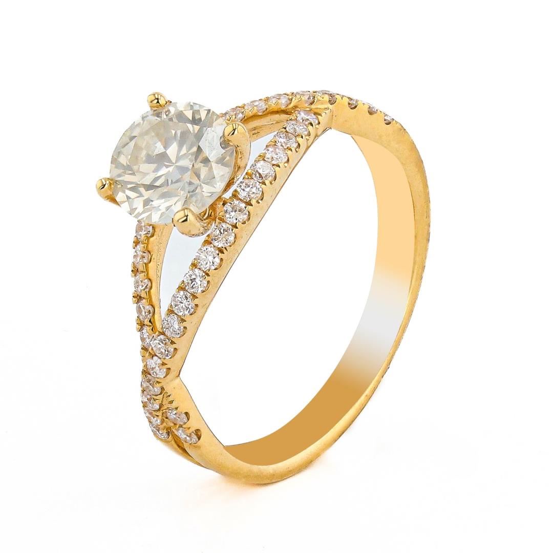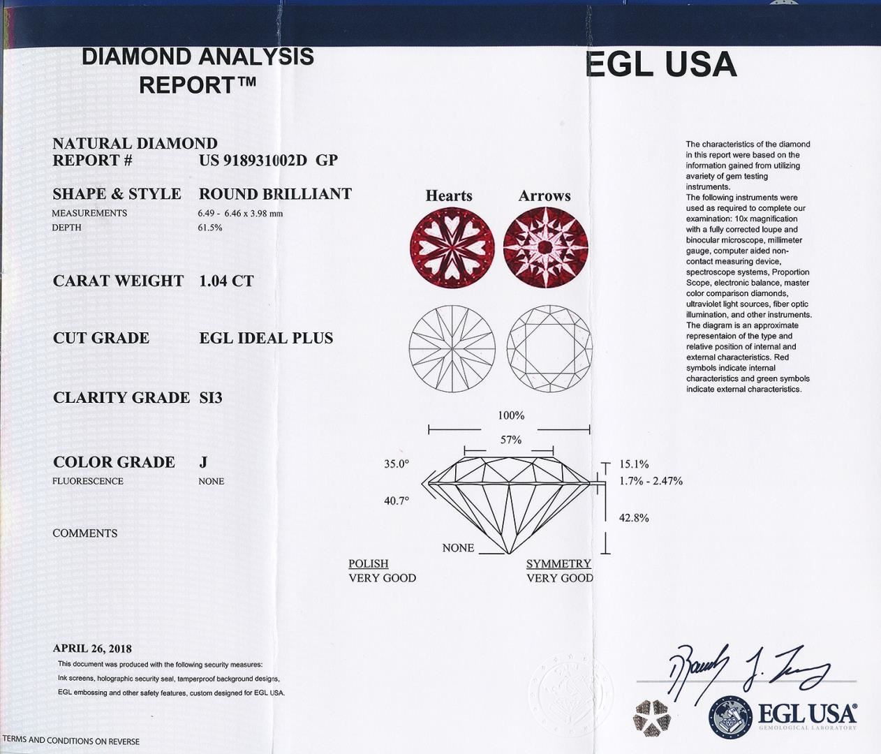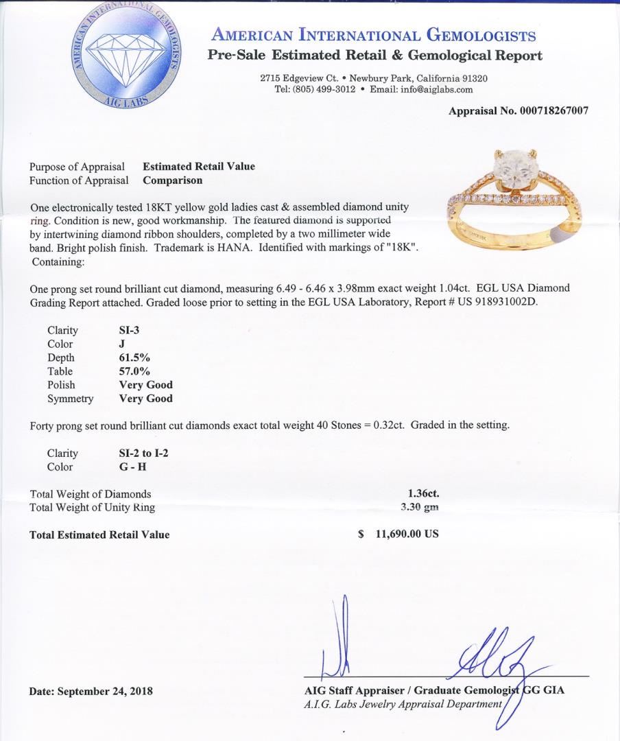 One electronically tested 18KT yellow gold ladies cast & assembled diamond unity ring. Condition is new, good workmanship. The featured diamond is supported by intertwining diamond ribbon shoulders, completed by a two millimeter wide band. Bright polish finish. Trademark is HANA. Identified with markings of "18K". One prong set round brilliant cut diamond, measuring 6.49 - 6.46 x 3.98mm exact weight 1.04ct. EGL USA Diamond Grading Report attached. Graded loose prior to setting in the EGL USA Laboratory, Report # US 918931002D Clarity: SI-3 Color: J Depth: 61.5% Table: 57.0% Polish: Very Good Symmetry: Very Good Forty prong set round brilliant cut diamonds exact total weight 40 Stones = 0.32ct. Graded in the setting. Clarity: SI-2 to I-2 Color: G - H Total Weight of Diamonds: 1.36ct Total Weight of Unity Ring: 3.30 gm #LREF-5593