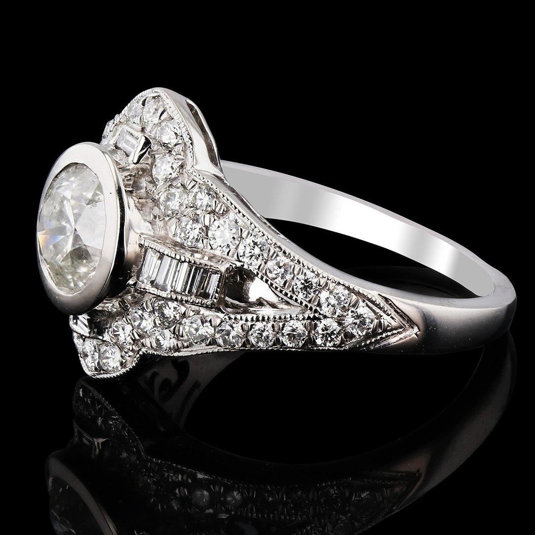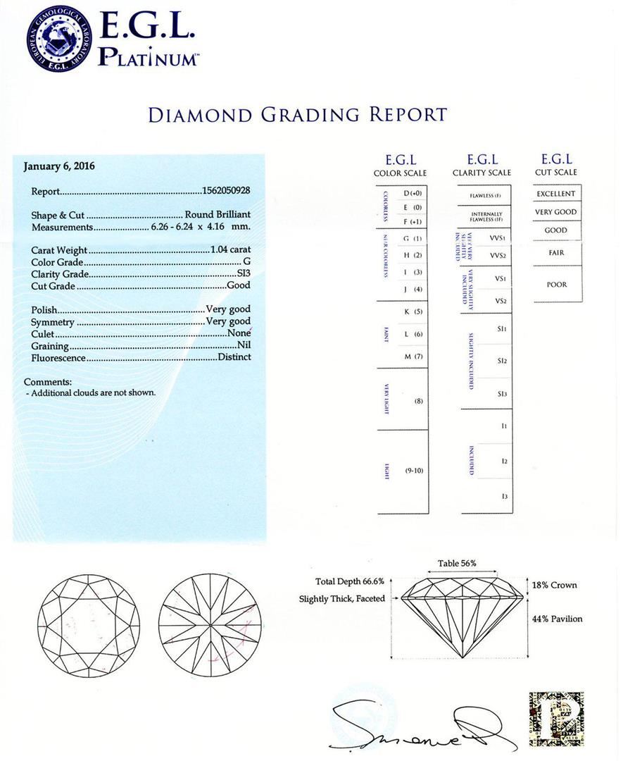 1.04ct SI3 CLARITY CENTER Diamond Platinum Ring (1.76ctw Diamonds) EGL CERTIFIED. One electronically tested platinum ladies cast diamond unity ring. Condition is new, good workmanship. The featured diamond is set Identified with markings of "PT950". Containing: One bezel set round brilliant cut diamond, measuring 6.26 - 6.24 x 4.16mm exact weight 1.04ct with a strong blue fluorescence. Graded loose prior to setting in the EGL Laboratory, Report 1562050928. Clarity SI3 Color G Depth 66.6% Table 56.0% Polish Very Good Symmetry Very Good Fifty-four prong & channel set round & baguette cut diamonds approximate total weight of 54 Stones = 0.72ctw. Graded in the setting. Clarity VS2 to SI2 Color F - H Total Weight of Diamonds 1.76ctw. Total Weight of Ring 9.30 gm