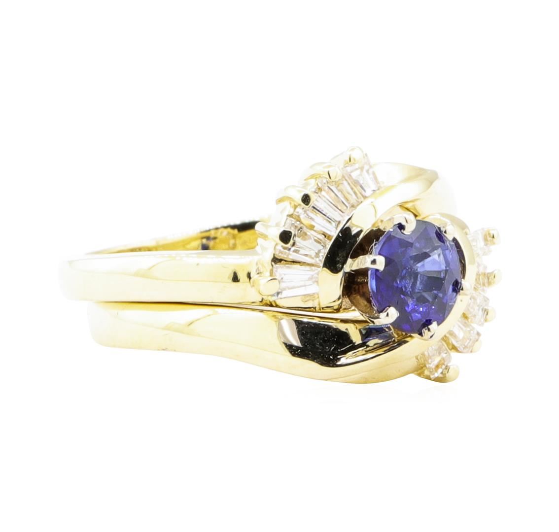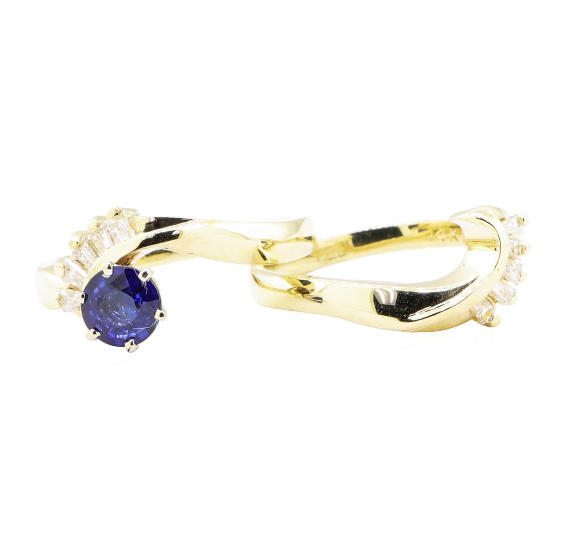 One set electronically tested 14KT yellow gold lady's combination cast & assembled fashion ring and band with a bypass swirl with a bright polish finish. The featured lady's ring has a double shank measuring 3.90 millimeters wide. Identified with markings of '14K'. Condition is Good. Containing: One prong set round modified mixed cut natural blue sapphire, measuring 5.60 - 5.55 x 3.00 mm, (depth est.) approximate weight of 0.74ct., clarity is slightly included, medium dark, very slightly grayish, blue color, (GIA B 6/3), cut is good. Transmitting light with no distortion, transparent. Colored gemstones are presumed to have been subjected to commonly used enhancement processes. Graded in the setting. Ten channel and prong set baguette cut diamonds, measuring from 2.00 x 1.30 x 1.11mm (depth est.) to 2.10 x 1.40 x 1.19mm (depth est.) approximate total weight of 10 Stones = 0.30ct. Graded in the setting. Color H - I Clarity VS-1 to VS-2 Cut Very Good. Total Weight of Colored Stones 0.74ct.. Total Weight of Diamonds 0.30ct.. Total Weight of Ring And Band 7.00gm GAS Appraised at $2820.00. GAS Appraised at $2,820.00.