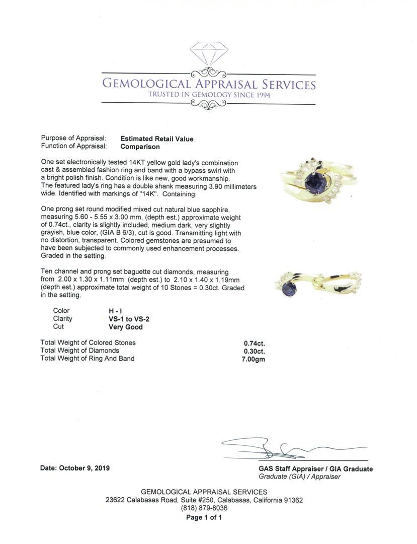 One set electronically tested 14KT yellow gold lady's combination cast & assembled fashion ring and band with a bypass swirl with a bright polish finish. The featured lady's ring has a double shank measuring 3.90 millimeters wide. Identified with markings of '14K'. Condition is Good. Containing: One prong set round modified mixed cut natural blue sapphire, measuring 5.60 - 5.55 x 3.00 mm, (depth est.) approximate weight of 0.74ct., clarity is slightly included, medium dark, very slightly grayish, blue color, (GIA B 6/3), cut is good. Transmitting light with no distortion, transparent. Colored gemstones are presumed to have been subjected to commonly used enhancement processes. Graded in the setting. Ten channel and prong set baguette cut diamonds, measuring from 2.00 x 1.30 x 1.11mm (depth est.) to 2.10 x 1.40 x 1.19mm (depth est.) approximate total weight of 10 Stones = 0.30ct. Graded in the setting. Color H - I Clarity VS-1 to VS-2 Cut Very Good. Total Weight of Colored Stones 0.74ct.. Total Weight of Diamonds 0.30ct.. Total Weight of Ring And Band 7.00gm GAS Appraised at $2820.00. GAS Appraised.