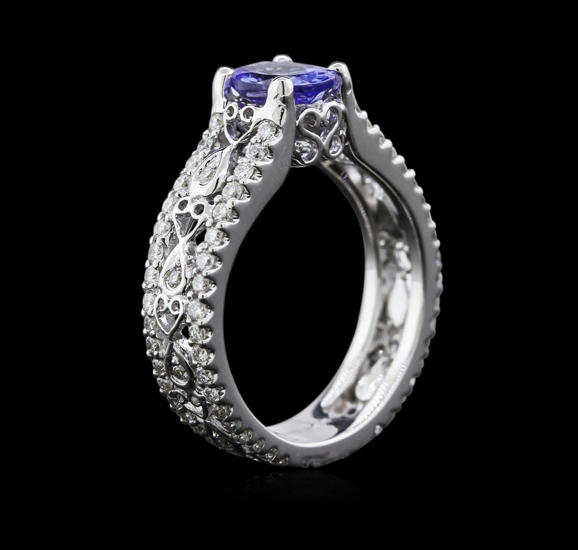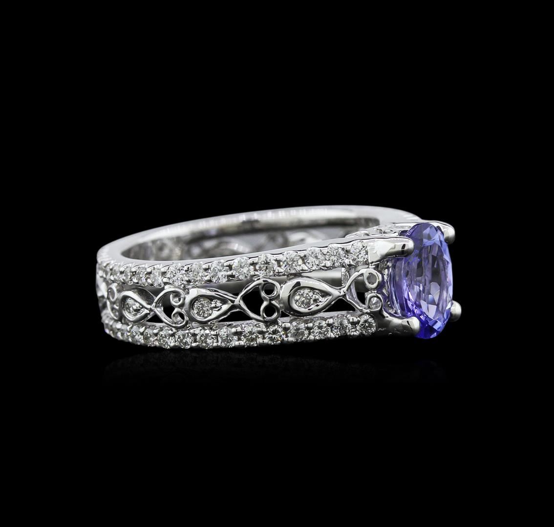One electronically tested 18KT white gold ladies cast tanzanite and diamond ring with a bright polish finish. Identified with markings of "K18". Condition is new. Containing: One prong set oval modified brilliant cut natural tanzanite, measuring 7.50 x 5.50 x 3.58mm, approximate weight of 1.04ct., clarity is eye clean, type I, medium light, slightly grayish, violet color, (GIA V 4/2), cut is good. Eighty-Four prong set round brilliant cut diamonds, measuring 1.30 - 1.30 x 0.78mm (depth est.) approximate total weight of 84 Stones = 0.69ct. Clarity: SI-1 to SI-2. Color: I - J, Cut is Good. Colored gemstones are presumed to have been subjected to commonly used enhancement processes. All diamonds and colored gemstones are graded in the mounting, unless otherwise stated. Total Weight of Colored Stones 1.04ct. Total Weight of Diamonds 0.69ct. Total Weight of Ring 5.80gm. GGL Appraised at $3,070.00.
