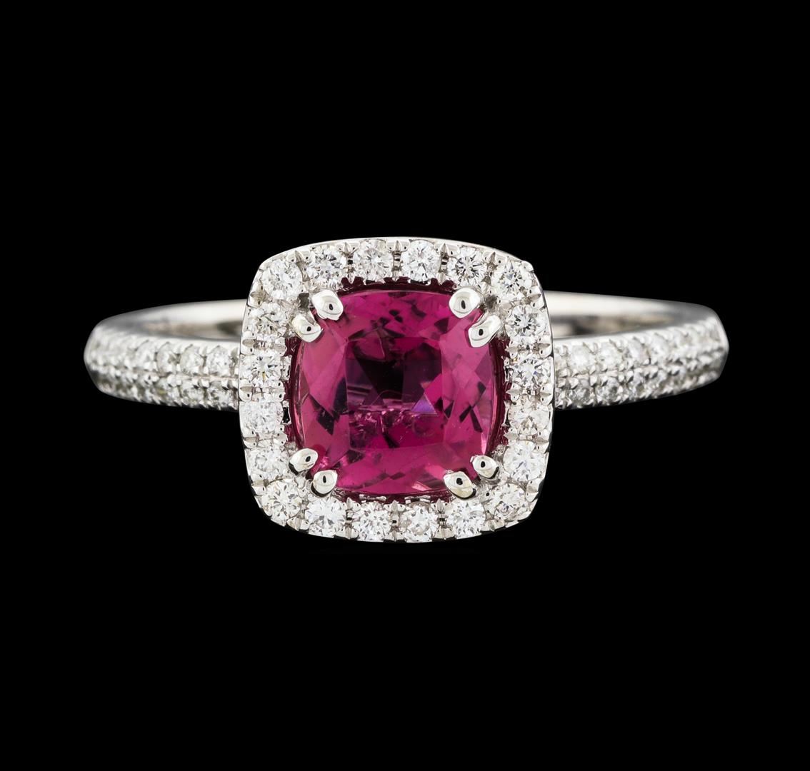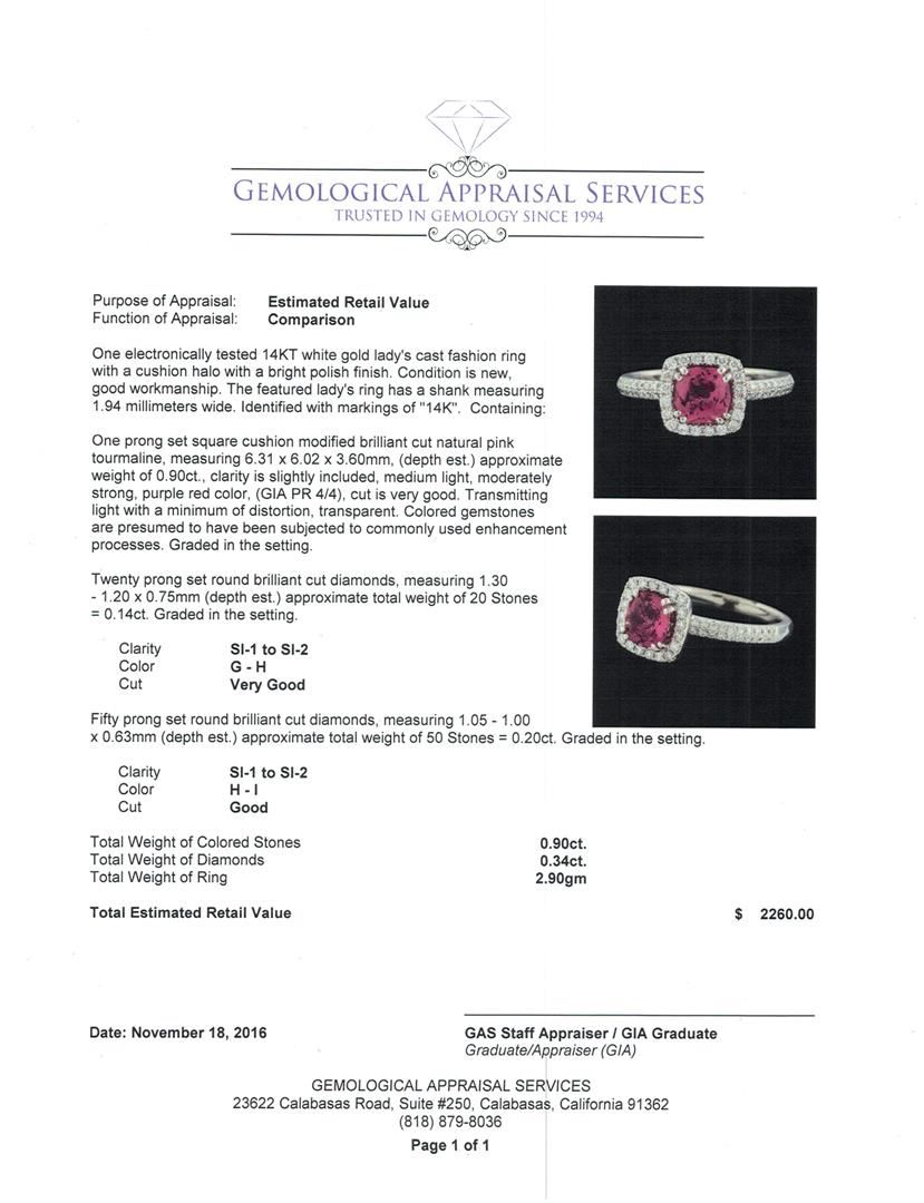 One electronically tested 14KT white gold lady's cast fashion ring with a cushion halo with a bright polish finish. The featured lady's ring has a shank measuring 1.94 millimeters wide. Identified with markings of '14K'. Condition is new, good workmanship. Containing: One prong set square cushion modified brilliant cut natural pink tourmaline, measuring 6.31 x 6.02 x 3.60mm, (depth est.) approximate weight of 0.90ct., clarity is slightly included, medium light, moderately strong, purple red color, (GIA PR 4/4), cut is very good. Transmitting light with a minimum of distortion, transparent. Colored gemstones are presumed to have been subjected to commonly used enhancement processes. Graded in the setting. Twenty prong set round brilliant cut diamonds, measuring 1.30 - 1.20 x 0.75mm (depth est.) approximate total weight of 20 Stones = 0.14ct. Graded in the setting. Clarity SI-1 to SI-2. Color: G - H Cut Very Good Fifty prong set round brilliant cut diamonds, measuring 1.05 - 1.00 x 0.63mm (depth est.) approximate total weight of 50 Stones = 0.20ct. Graded in the setting. Clarity SI-1 to SI-2. Color: H - I Cut Good. Total Weight of Colored Stones 0.90ct.. Total Weight of Diamonds 0.34ct.. Total Weight of Ring 2.90gm. GAS Appraised at $2,260.00.