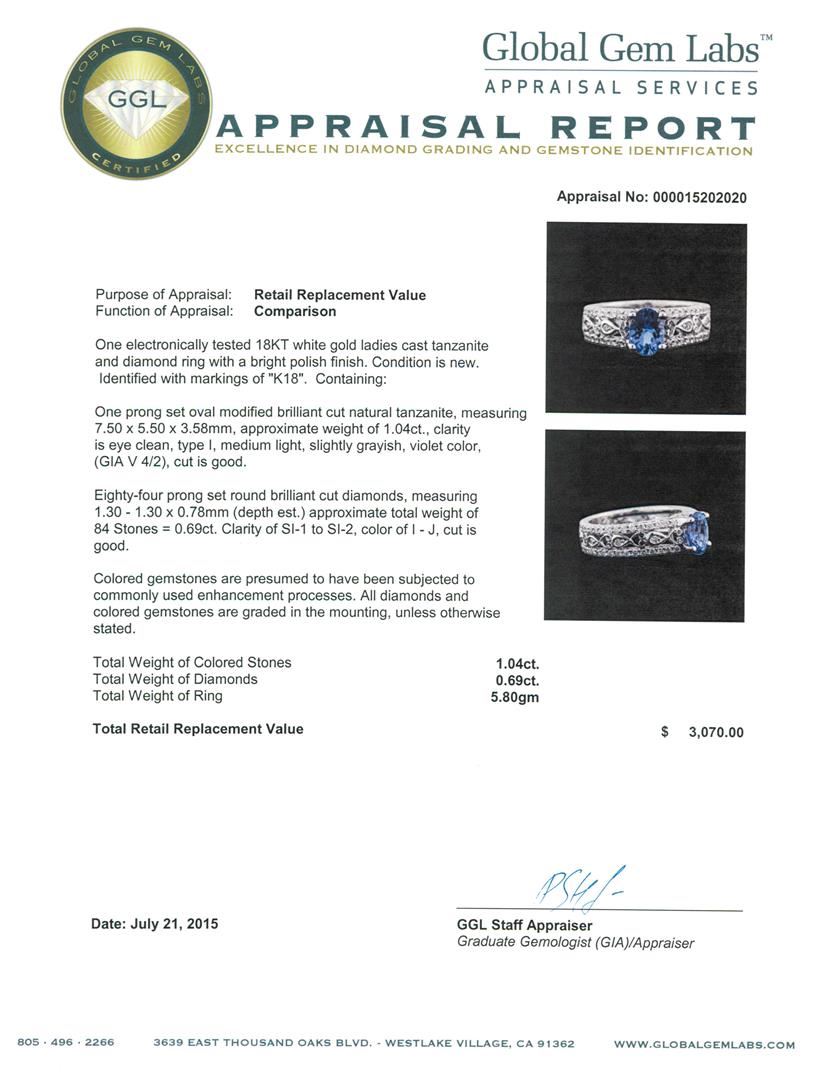 One electronically tested 18KT white gold ladies cast tanzanite and diamond ring with a bright polish finish. Identified with markings of "K18". Condition is new. Containing: One prong set oval modified brilliant cut natural tanzanite, measuring 7.50 x 5.50 x 3.58mm, approximate weight of 1.04ct., clarity is eye clean, type I, medium light, slightly grayish, violet color, (GIA V 4/2), cut is good. Eighty-Four prong set round brilliant cut diamonds, measuring 1.30 - 1.30 x 0.78mm (depth est.) approximate total weight of 84 Stones = 0.69ct. Clarity: SI-1 to SI-2. Color: I - J, Cut is Good. Colored gemstones are presumed to have been subjected to commonly used enhancement processes. All diamonds and colored gemstones are graded in the mounting, unless otherwise stated. Total Weight of Colored Stones 1.04ct. Total Weight of Diamonds 0.69ct. Total Weight of Ring 5.80gm. GGL Appraised at $3,070.00.