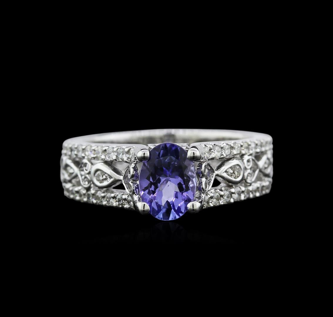 One electronically tested 18KT white gold ladies cast tanzanite and diamond ring with a bright polish finish. Identified with markings of "K18". Condition is new. Containing: One prong set oval modified brilliant cut natural tanzanite, measuring 7.50 x 5.50 x 3.58mm, approximate weight of 1.04ct., clarity is eye clean, type I, medium light, slightly grayish, violet color, (GIA V 4/2), cut is good. Eighty-Four prong set round brilliant cut diamonds, measuring 1.30 - 1.30 x 0.78mm (depth est.) approximate total weight of 84 Stones = 0.69ct. Clarity: SI-1 to SI-2. Color: I - J, Cut is Good. Colored gemstones are presumed to have been subjected to commonly used enhancement processes. All diamonds and colored gemstones are graded in the mounting, unless otherwise stated. Total Weight of Colored Stones 1.04ct. Total Weight of Diamonds 0.69ct. Total Weight of Ring 5.80gm. GGL Appraised at $3,070.00.