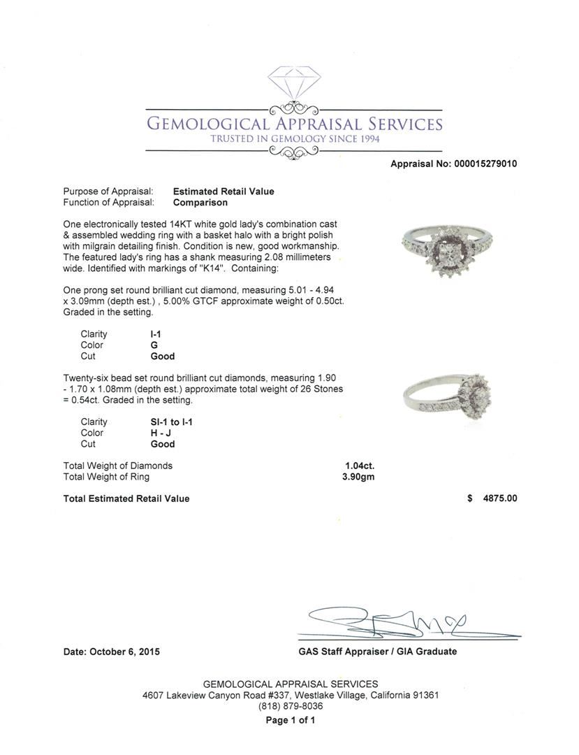 One electronically tested 14KT white gold lady's combination cast & assembled wedding ring with a basket halo with a bright polish with milgrain detailing finish. The featured lady's ring has a shank measuring 2.08 millimeters wide. Identified with markings of "K14". Condition is new, good workmanship. Containing: One prong set round brilliant cut diamond, measuring 5.01 - 4.94 x 3.09mm (depth est.) , 5.00.%. GTCF approximate weight of 0.50ct. Graded in the setting. Clarity: I-1. Color: G. Cut Good Twenty-Six bead set round brilliant cut diamonds, measuring 1.90 - 1.70 x 1.08mm (depth est.) approximate total weight of 26 Stones = 0.54ct. Graded in the setting. Clarity: SI-1 to I-1. Color: H - Good. Total Weight of Diamonds 1.04ct. Total Weight of Ring 3.90gm. GAS Appraised at $4,875.00.