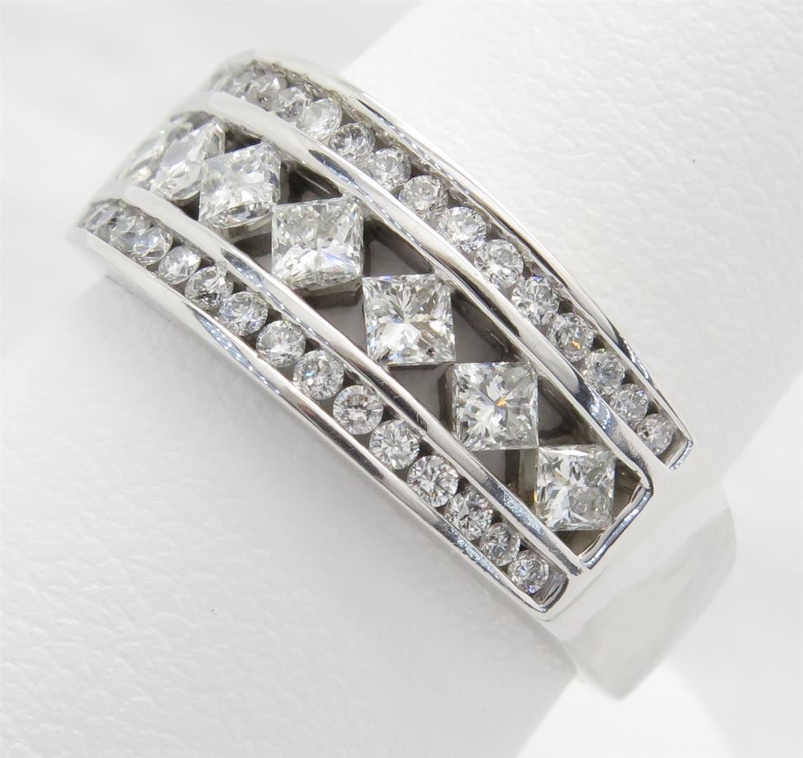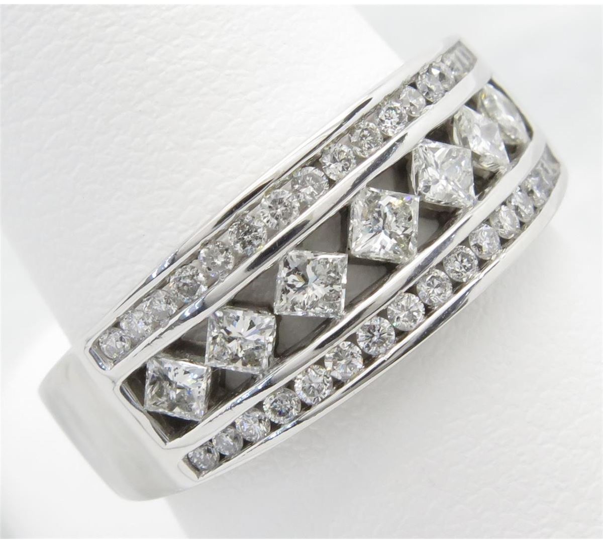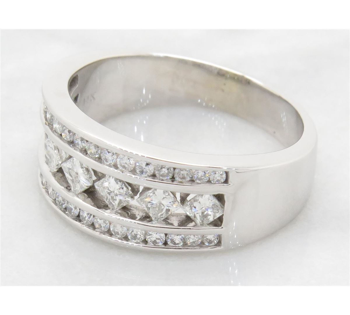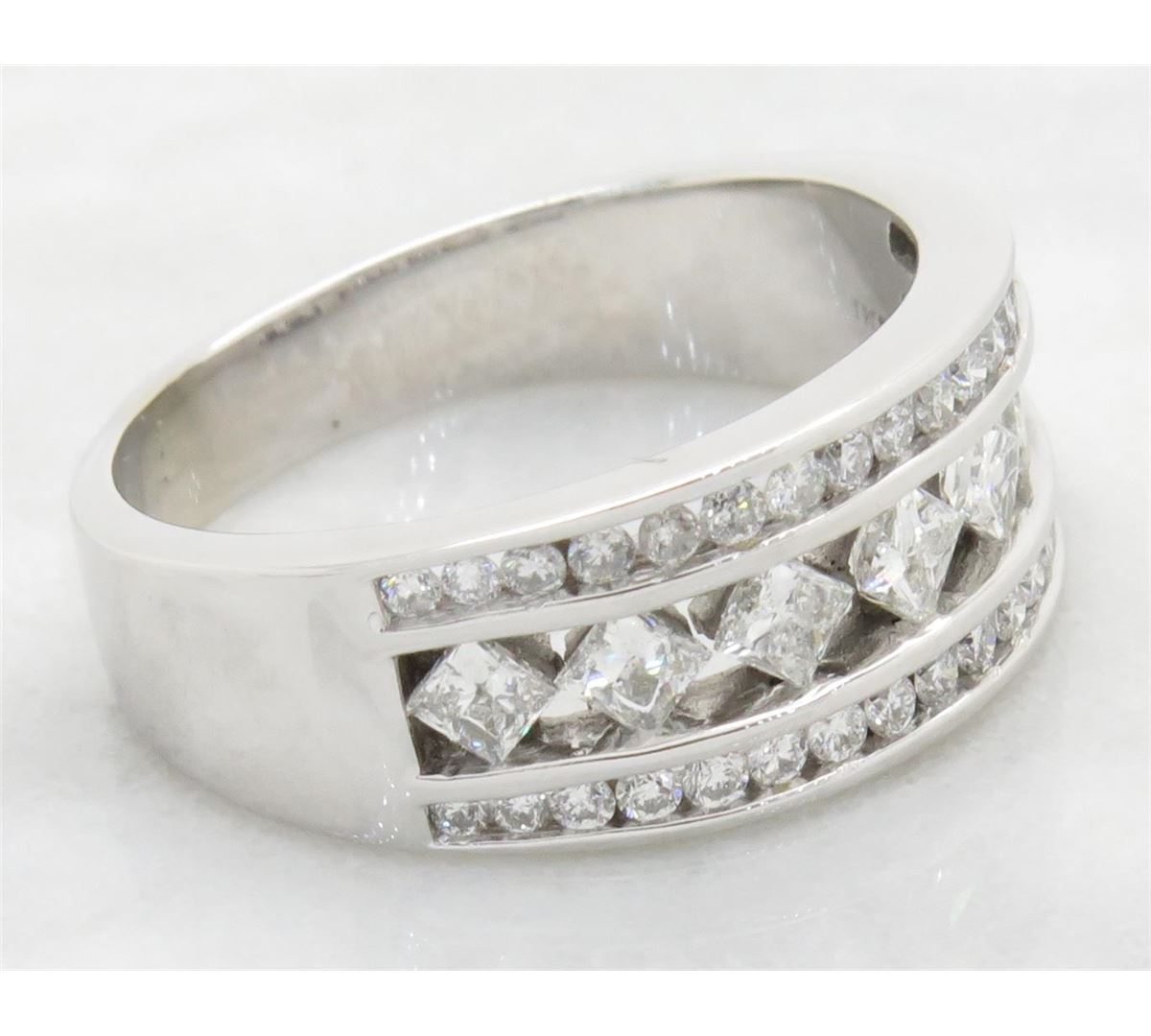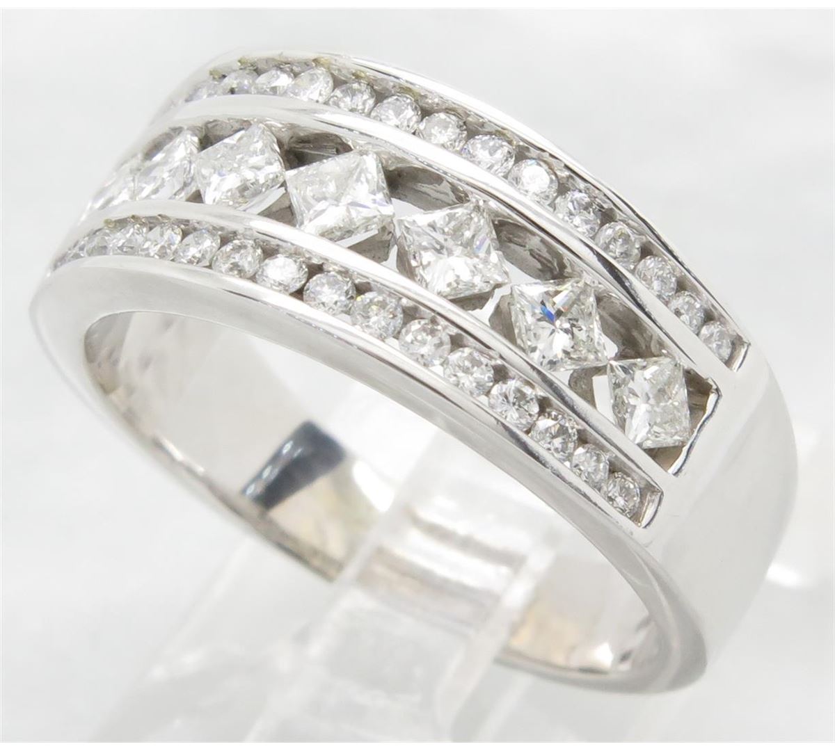 One tested 14K white gold diamond ring. Condition is new. Containing: Seven Princess cut diamonds and thirty-four Round Brilliant cut diamonds. Approximate total diamond weight: 1.04CTW. Diamonds are graded in the mounting, unless otherwise stated. Weight of ring: 6.2 grams. Size: 7