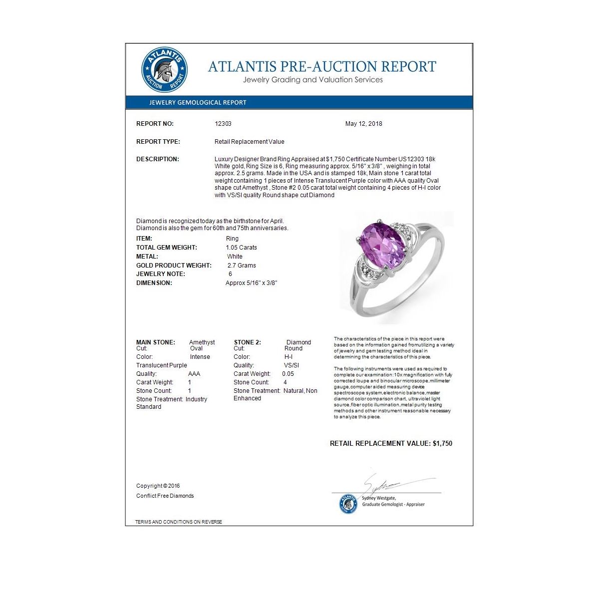 REF-26M2H -12303 ---- 1.05 CTW Amethyst & Diamond Ring 18K White Gold ---- Luxury Designer Brand Ring Appraised at $1,750 Certificate Number US12303 18k White gold, Ring Size is 6, Ring measuring approx. 5/16" x 3/8" , weighing in total approx. 2.5 grams. Made in the USA and is stamped 18k, Main stone 1 carat total weight containing 1 pieces of Intense Translucent Purple color with AAA quality Oval shape cut Amethyst , Stone #2 0.05 carat total weight containing 4 pieces of H-I color with VS/SI quality Round shape cut Diamond