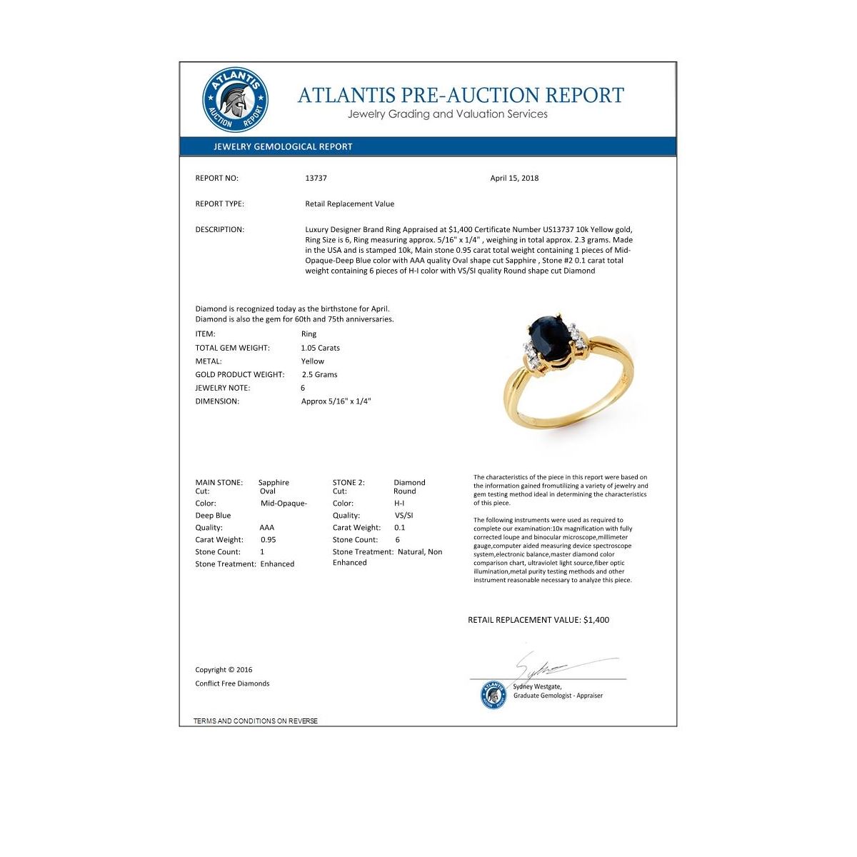 REF-22X8T -13737 ---- 1.05 CTW Blue Sapphire & Diamond Ring 10K Yellow Gold ---- Luxury Designer Brand Ring Appraised at $1,400 Certificate Number US13737 10k Yellow gold, Ring Size is 6, Ring measuring approx. 5/16" x 1/4" , weighing in total approx. 2.3 grams. Made in the USA and is stamped 10k, Main stone 0.95 carat total weight containing 1 pieces of Mid-Opaque-Deep Blue color with AAA quality Oval shape cut Sapphire , Stone #2 0.1 carat total weight containing 6 pieces of H-I color with VS/SI quality Round shape cut Diamond