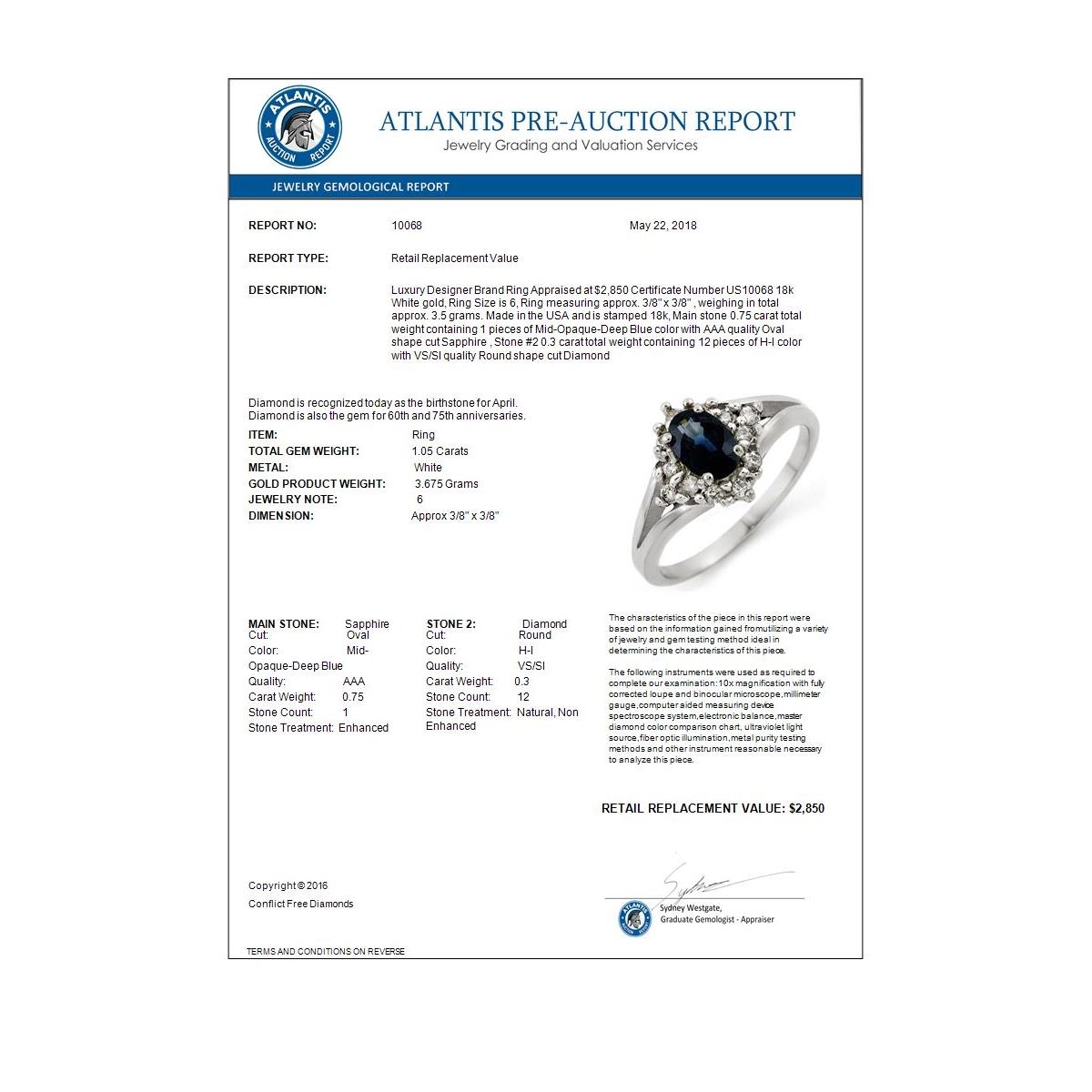 REF-47X3T -10068 ---- 1.05 CTW Blue Sapphire & Diamond Ring 18K White Gold ---- Luxury Designer Brand Ring Appraised at $2,850 Certificate Number US10068  18k White gold,  Ring Size is 6, Ring measuring approx. 3/8" x  3/8" , weighing in total approx. 3.5 grams. Made in the USA and is stamped 18k, Main stone 0.75 carat total weight containing 1 pieces of Mid-Opaque-Deep Blue color with AAA quality Oval shape cut Sapphire , Stone #2 0.3 carat total weight containing 12 pieces of H-I color with  VS/SI quality Round shape cut Diamond