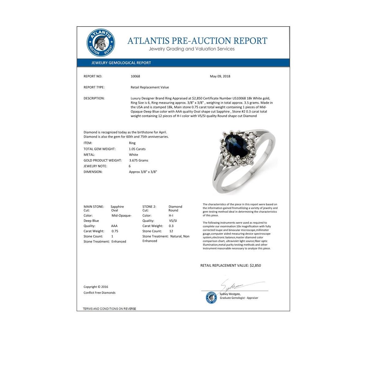 REF-47X3T -10068 ---- 1.05 CTW Blue Sapphire & Diamond Ring 18K White Gold ---- Luxury Designer Brand Ring Appraised at $2,850 Certificate Number US10068 18k White gold, Ring Size is 6, Ring measuring approx. 3/8" x 3/8" , weighing in total approx. 3.5 grams. Made in the USA and is stamped 18k, Main stone 0.75 carat total weight containing 1 pieces of Mid-Opaque-Deep Blue color with AAA quality Oval shape cut Sapphire , Stone #2 0.3 carat total weight containing 12 pieces of H-I color with VS/SI quality Round shape cut Diamond