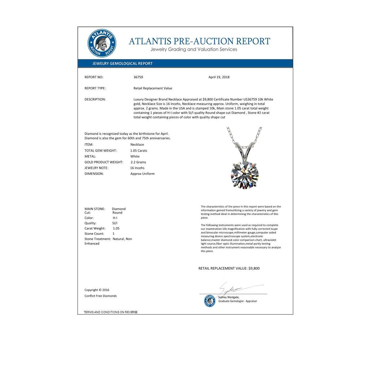 REF-147M2H -36759 ---- 1.05 CTW Certified H-SI/I Quality Diamond Solitaire Necklace 10K White Gold ---- Luxury Designer Brand Necklace Appraised at $9,800 Certificate Number US36759 10k White gold, Necklace Size is 16 Incehs, Necklace measuring approx. Uniform, weighing in total approx. 2 grams. Made in the USA and is stamped 10k, Main stone 1.05 carat total weight containing 1 pieces of H-I color with SI/I quality Round shape cut Diamond , Stone #2 carat total weight containing pieces of color with quality shape cut