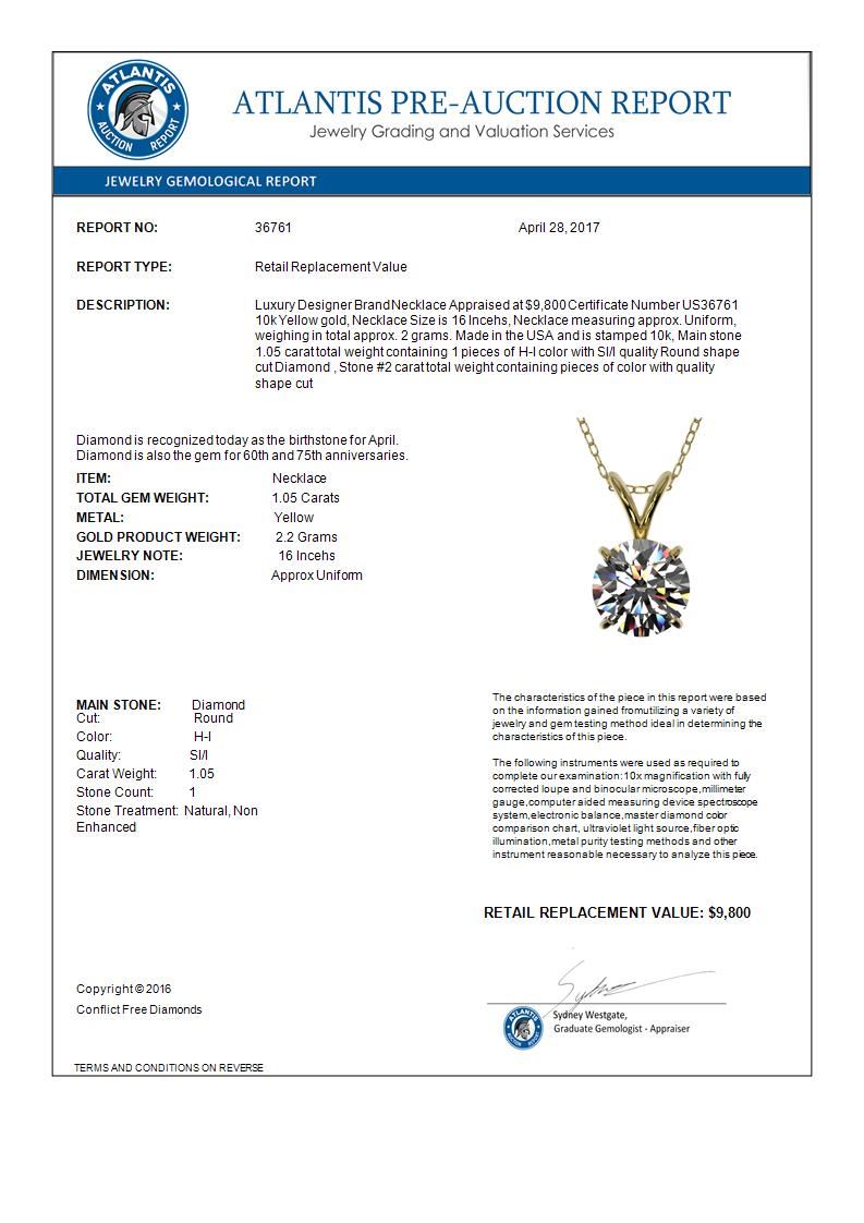 1.05 CTW Certified H-SI/I Quality Diamond Solitaire Necklace 10K Yellow Gold ---- Luxury Designer Brand Necklace Appraised Retail Price at $9,800 ---- SKU Number US36761 10k Yellow gold Necklace Size is 16 Incehs, Necklace measuring approx. Uniform, weighing in total approx. 2 grams. Made in the USA and is stamped 10k, Main stone 1.05 carat total weight containing 1 pieces of H-I color with SI/I quality Round shape cut Diamond , Stone #2 carat total weight containing pieces of color with quality shape cut