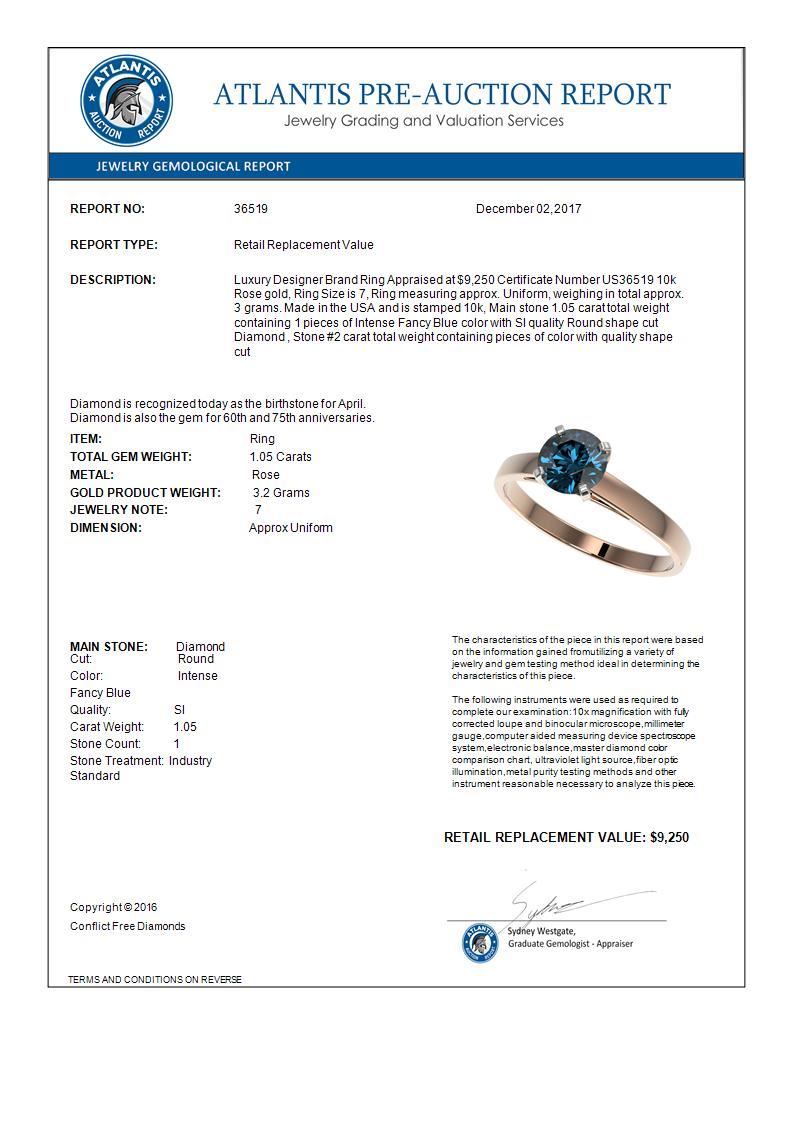 REF-115X8T -36519 ---- 1.05 CTW Certified Intense Blue SI Diamond Solitaire Engagement Ring 10K Rose Gold ---- Luxury Designer Brand Ring Appraised at $9,250 Certificate Number US36519 10k Rose gold, Ring Size is 7, Ring measuring approx. Uniform, weighing in total approx. 3 grams. Made in the USA and is stamped 10k, Main stone 1.05 carat total weight containing 1 pieces of Intense Fancy Blue color with SI quality Round shape cut Diamond , Stone #2 carat total weight containing pieces of color with quality shape cut