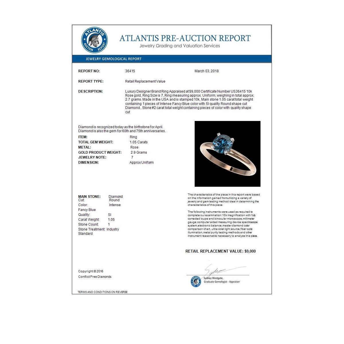 REF-136T4M -36415 ---- 1.05 CTW Certified Intense Blue SI Diamond Solitaire Engagement Ring 10K Rose Gold ---- Luxury Designer Brand Ring Appraised at $9,000 Certificate Number US36415  10k Rose gold,  Ring Size is 7, Ring measuring approx. Uniform, weighing in total approx. 2.7 grams. Made in the USA and is stamped 10k, Main stone 1.05 carat total weight containing 1 pieces of Intense Fancy Blue color with SI  quality Round shape cut Diamond , Stone #2  carat total weight containing  pieces of  color with quality  shape cut
