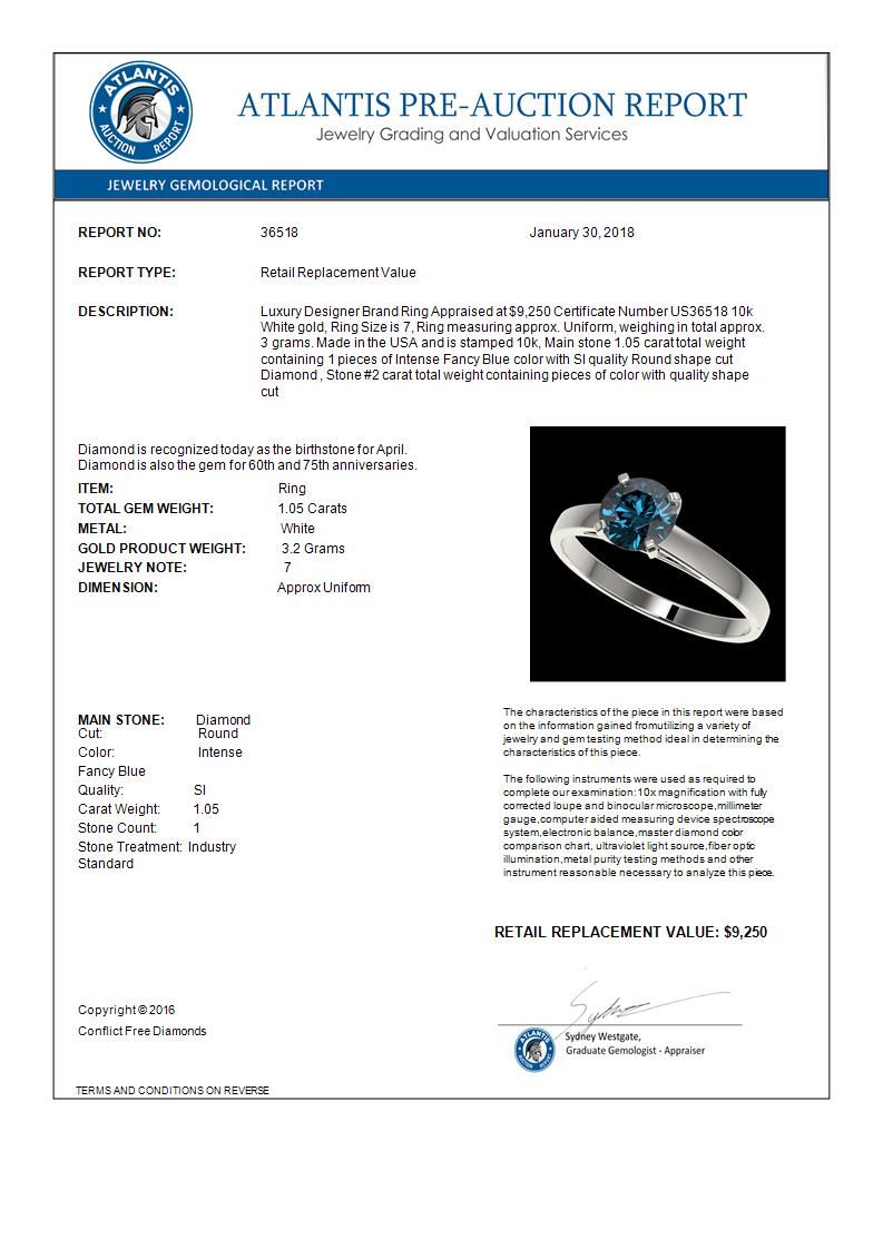 REF-115X8T -36518 ---- 1.05 CTW Certified Intense Blue SI Diamond Solitaire Engagement Ring 10K White Gold ---- Luxury Designer Brand Ring Appraised at $9,250 Certificate Number US36518 10k White gold, Ring Size is 7, Ring measuring approx. Uniform, weighing in total approx. 3 grams. Made in the USA and is stamped 10k, Main stone 1.05 carat total weight containing 1 pieces of Intense Fancy Blue color with SI quality Round shape cut Diamond , Stone #2 carat total weight containing pieces of color with quality shape cut