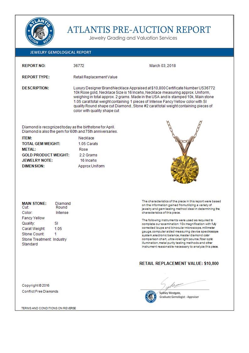 REF-147M2H -36772 ---- 1.05 CTW Certified Intense Yellow SI Diamond Solitaire Necklace 10K Rose Gold ---- Luxury Designer Brand Necklace Appraised at $10,800 Certificate Number US36772 10k Rose gold, Necklace Size is 16 Incehs, Necklace measuring approx. Uniform, weighing in total approx. 2 grams. Made in the USA and is stamped 10k, Main stone 1.05 carat total weight containing 1 pieces of Intense Fancy Yellow color with SI quality Round shape cut Diamond , Stone #2 carat total weight containing pieces of color with quality shape cut