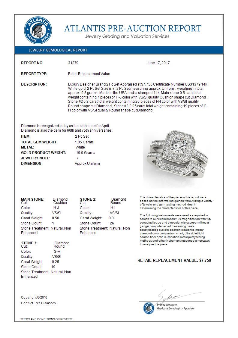1.05 CTW Certified VS/SI Cushion Diamond 2Pc Set Solitaire Halo 14K White Gold ---- Luxury Designer Brand 2 Pc Set Appraised Retail Price at $7,750 ---- SKU Number US31379 14k White gold 2 Pc Set Size is 7, 2 Pc Set measuring approx. Uniform, weighing in total approx. 9.8 grams. Made in the USA and is stamped 14k, Main stone 0.50 carat total weight containing 1 pieces of H-J color with VS/SI quality Cushion shape cut Diamond , Stone #2 0.3 carat total weight containing 26 pieces of H-I color with VS/SI quality Round shape cut
